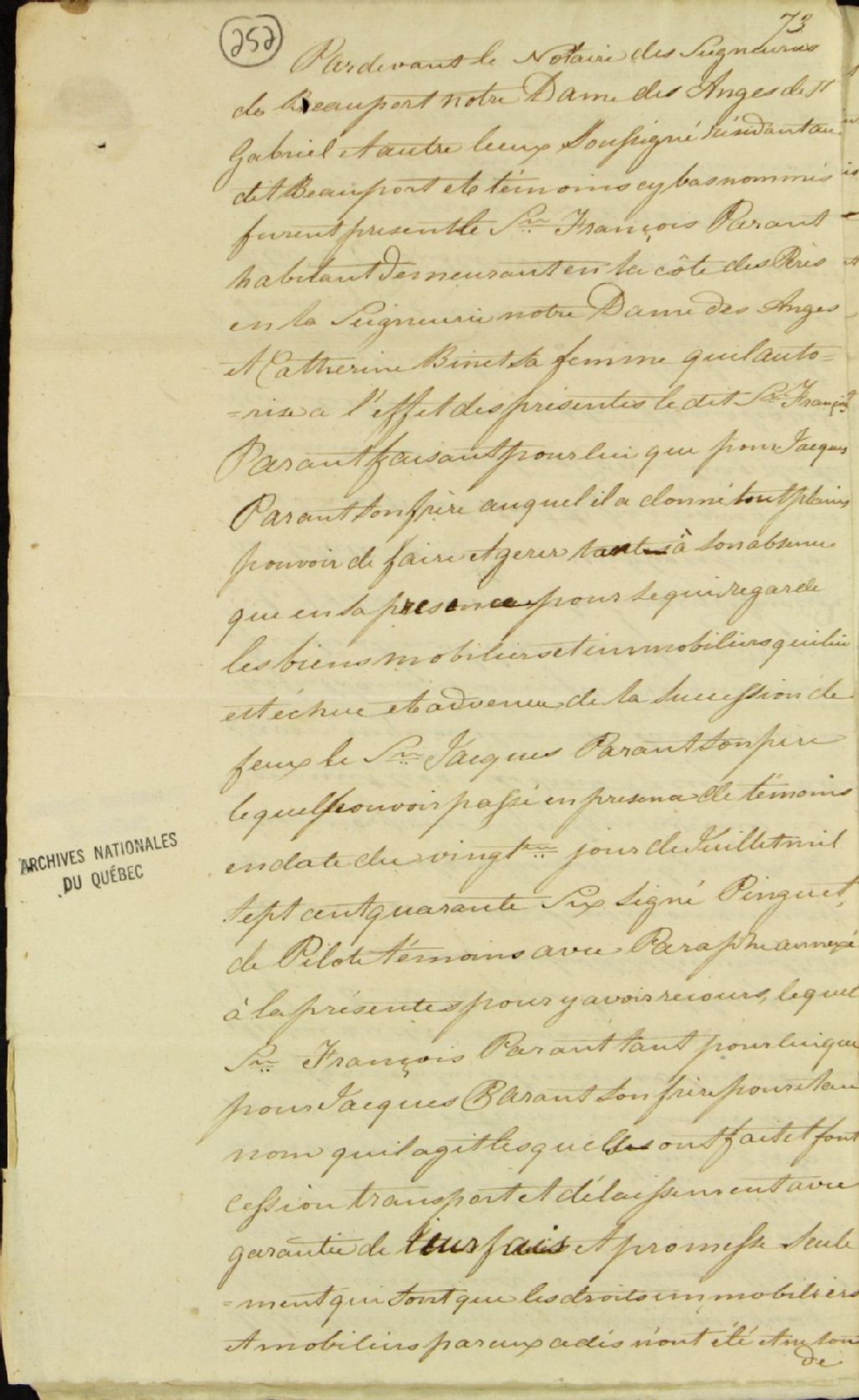 Cession de droits immobiliers et mobiliers provenant de la sucession du défunt sieur Jacques Parent par le sieur François Parent, habitant demeurant en la Côte-des-Pères en la seigneurie Notre-Dame-des-Anges, et par Catherine Binet, sa femme, ledit sieur Parent faisant tant pour lui que pour Jacques Parent, son frère, en faveur du sieur Simon Parent, frère desdits François et Jacques Parent, demeurant à la Canardière, lesdits sieurs cédants et l'acquéreur étant tous trois fils dudit défunt sieur Jacques Parent, 23 juillet 1746, Archives nationales à Québec, Fonds Ministère des Terres et Forêts, (03Q,E21,S64,SS5,SSS5,D252).