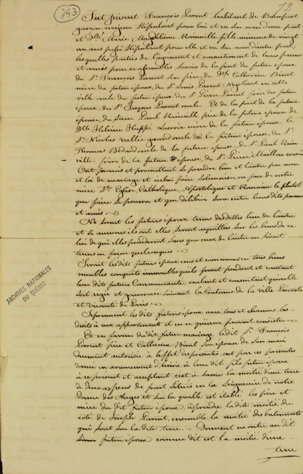 Contrat de mariage entre François Parent, habitant de Beauport, fils majeur du sieur François Parent et de demoiselle Catherine Binet, et Marie-Madeleine Rainville, fille mineure (vingt et un ans) du sieur Paul Rainville et de demoiselle Hélène Huppé dit Lagroix, 12 novembre 1752, Archives nationales à Québec, Fonds Ministère des Terres et Forêts, (03Q,E21,S64,SS5,SSS5,D253).