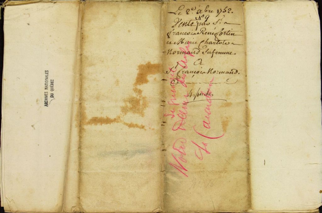 - Contrat de vente d'une portion de terre située à la Canardière en la seigneurie de Notre-Dame-des-Anges par le sieur François-René Fortin et par Marie-Charlotte Normand, sa femme, habitants demeurant au Cap-Saint-Ignace, au sieur François Normand, habitant demeurant audit lieu de la Canardière, leur oncle