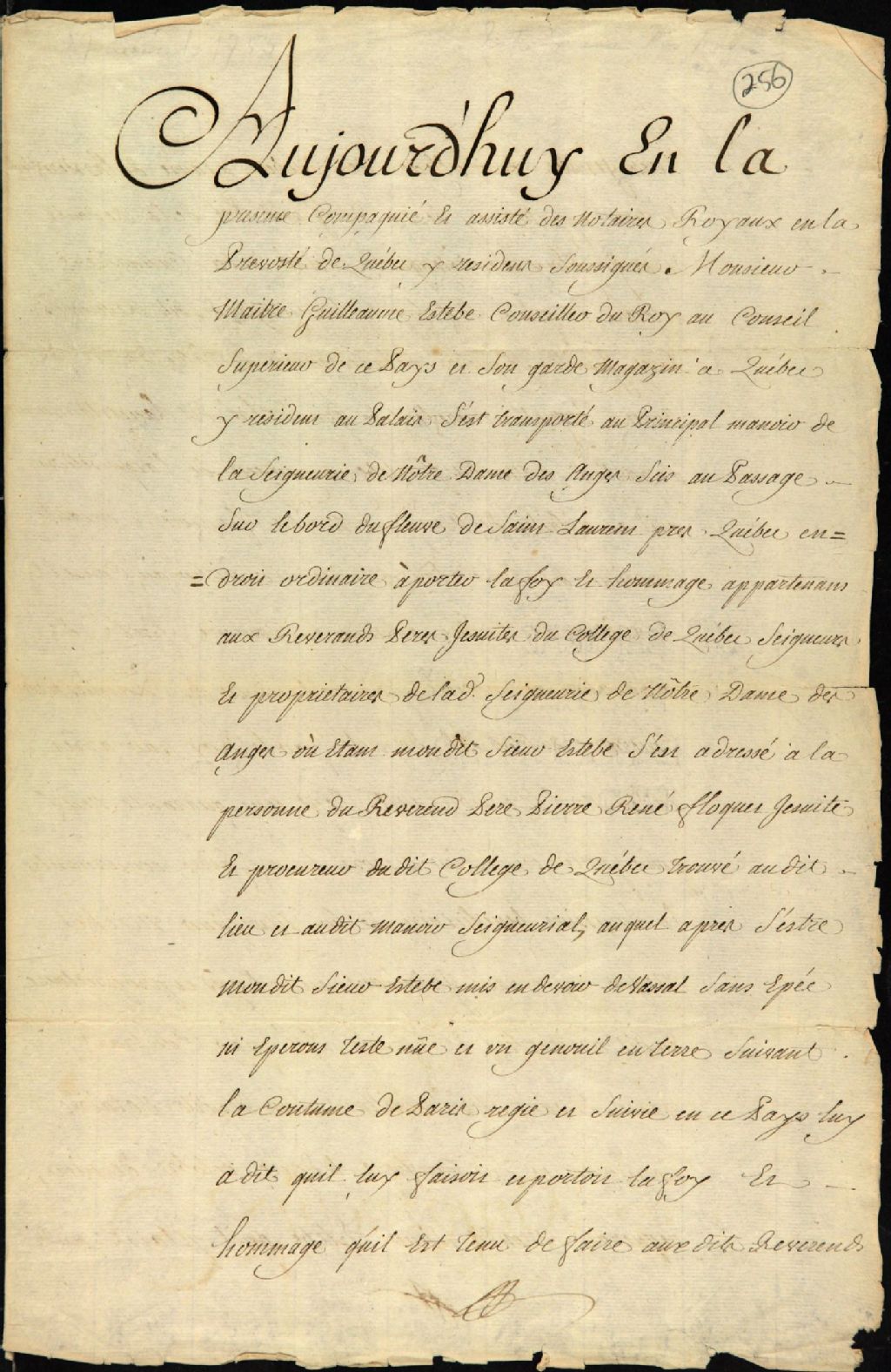 Acte de foi et hommage fait au principal manoir de la seigneurie de Notre-Dame-des-Anges situé au passage sur le bord du fleuve Saint-Laurent devant les Révérends Pères Jésuites par maître Guillaume Estebe, conseiller du Roi au Conseil supérieur et son garde-magasin à Québec, résidant au Palais, pour l'arrière-fief de Grandpré (Grandpré-de-la-Redoute ou de la Mistanguienne), situé à la Canardière, lequel appartient audit sieur Estebe de par l'acquisition qu'il en a faite de maître François Foucault, premier conseiller du Roi au Conseil supérieur, au nom et comme fondé de procuration pour juger en dernier ressort les affaires concernant la succession bénéficiaire de feu monsieur Michel Bégon, ci-devant intentant et proprétaire dudit arrière-fief de Grandpré