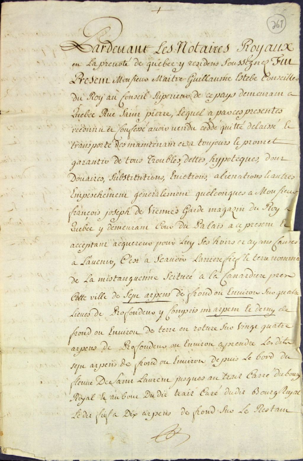 - Contrat de vente de l'arrière-fief de la Mistanguienne (Grandpré, Grandpré-de-la-Redoute, Montplaisir) situé à la Canardière par maître Guillaume Estebe, conseiller du Roi au Conseil supérieur, demeurant à Québec rue Saint-Pierre, à François-Joseph de Vienne, garde-magasin du Roi à Québec, y demeurant Cour du Palais