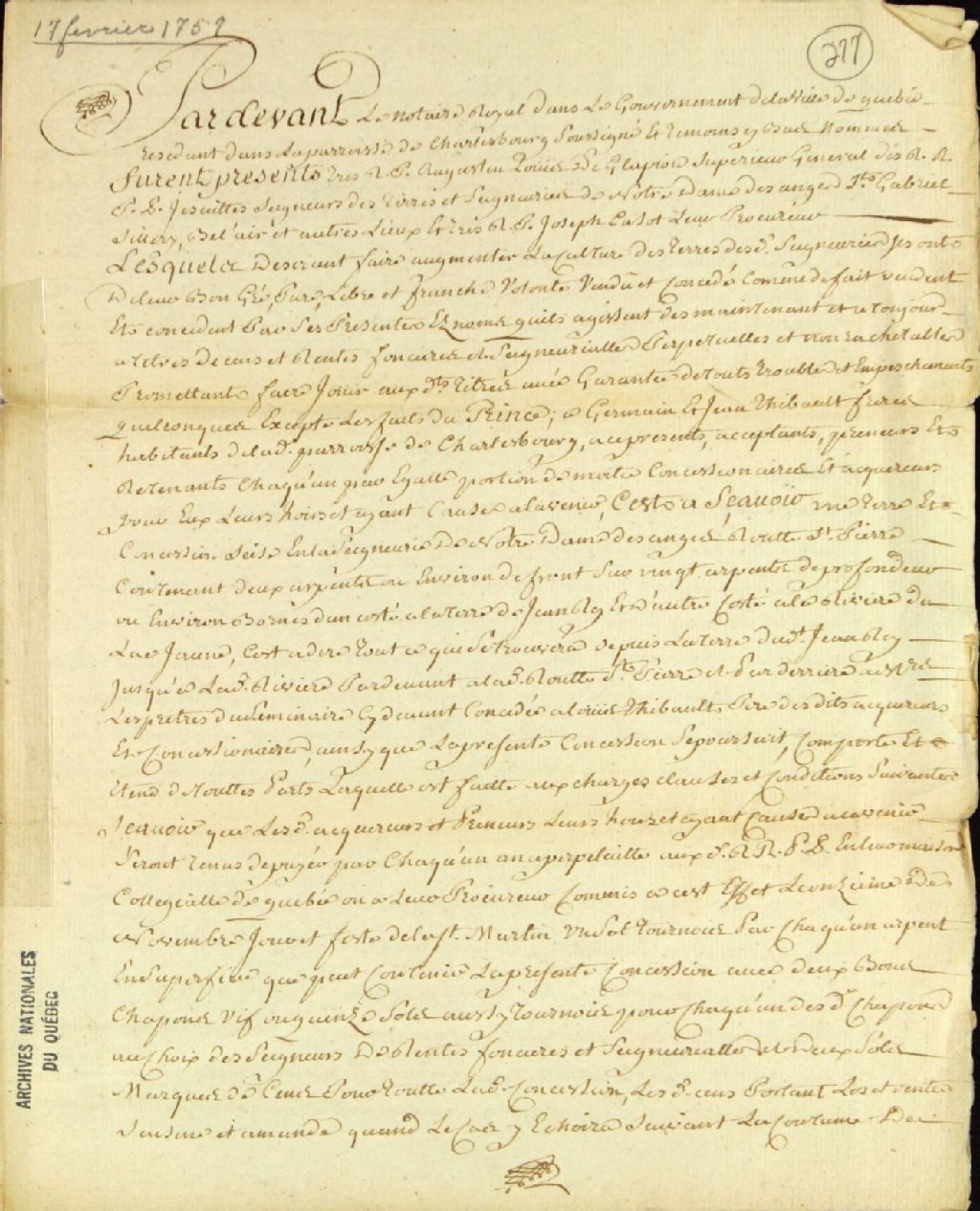 Acte de concession d'une terre située en la route Saint-Pierre en la seigneurie de Notre-Dame-des-Anges par les Révérends Pères Jésuites, seigneurs des seigneuries de Notre-Dame-des-Anges, Saint-Gabriel, Sillery, Bélair et autres lieux, à Germain Thibault et à Jean Thibault, frères, habitants de la paroisse de Charlesbourg, par-devant Genest, notaire royal dans le gouvernement de la ville de Québec, 17 février 1772, Archives nationales à Québec, Fonds Ministère des Terres et Forêts, (03Q,E21,S64,SS5,SSS5,D277).