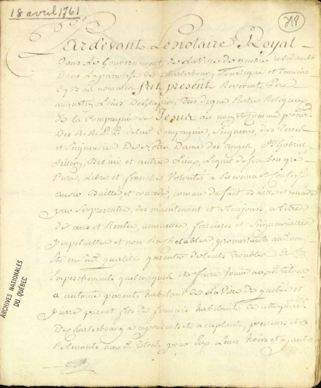 Acte de concession d'une terre située dans la côte Saint-Pierre dans le fief de Notre-Dame-des-Anges par les Révérends Pères Jésuites, seigneurs des seigneuries de Notre-Dame-des-Anges, Saint-Gabriel, Sillery, Bélair et autres lieux, à Antoine Parent, habitant de la ville de Québec, et à Pierre Parent, fils de François Parent, habitant de la paroisse de Charlesbourg, par-devant Genest, notaire royal dans le gouvernement de la ville de Québec