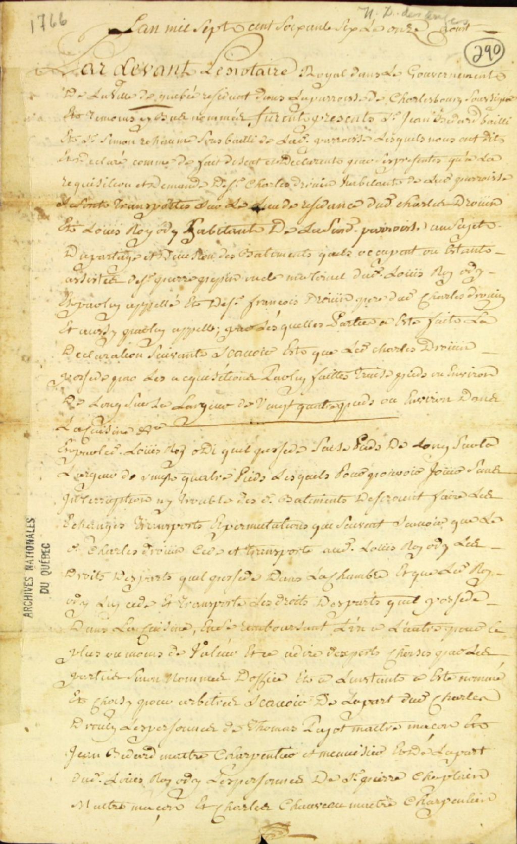 Estimation en vue du partage des bâtiments qu'occupent le sieur Charles Drouin, habitant de la paroisse de Charlesbourg, et Louis Roy dit Audy, aussi habitant de ladite paroisse, par le sieur Jean Bédard, bailli, et le sieur Simon Réaume, sous-bailli de ladite paroisse, assistés du sieur Pierre Pepin, oncle maternel dudit Louis Roy dit Audy, et du sieur François Drouin, père dudit Charles Drouin, et des experts et arbitres Thomas Pageau (Pageot), maître maçon, et Jean Bédard, maître charpentier et menuisier, de la part de Charles Drouin, et Pierre Chapelain, maître maçon, et Charles Chauveau, maître charpentier, de la part de Louis Roy dit Audy