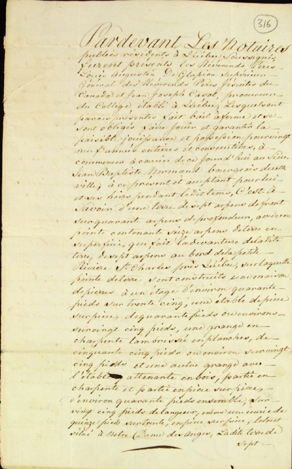 Bail emphytéotique [de longue durée] d'une terre dont la devanture se trouve au bord de la Petite Rivière Saint-Charles près de Québec, en la seigneurie de Notre-Dame-des-Anges, par les Révérends Pères Jésuites au sieur Jean-Baptiste Normand, bourgeois de Québec, pour vingt-neuf années entières et consécutives