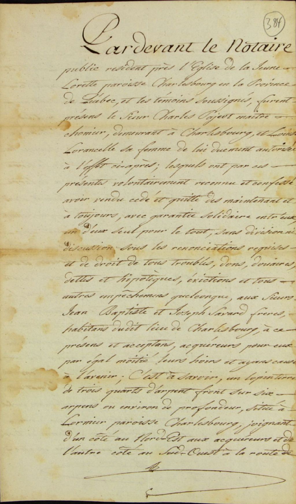 Contrat de vente d'un lopin de terre situé à Lormier (l'Ormier) en la paroisse de Charlesbourg par le sieur Charles Pageau (Pageot), maître chaumier, demeurant à Charlesbourg, et Louise Laurencelle, sa femme, aux sieurs Jean-Baptiste Savard et Joseph Savard, frères, habitant dudit lieu de Charlesbourg, lesdits frères achetant chacun la moitié dudit lopin, par-devant Jean-Baptiste Panet, notaire public