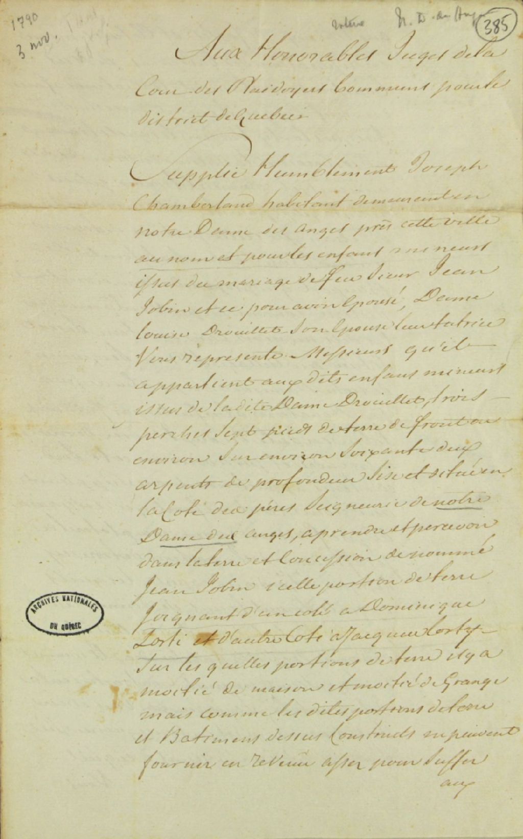Requête de Joseph Chamberland, habitant demeurant à Notre-Dame-des-Anges près de la ville de Québec, au nom et faisant pour les enfants mineurs du défunt sieur Jean Jobin, et ce, comme ayant épousé dame Louise Drouillet, leur mère et tutrice, aux Honorables Juges de la Cour des plaidoyers communs pour le District de Québec, ledit Chamberland demandant l'autorisation de procéder à l'échange d'une terre située en la Côte-des-Pères en la seigneurie de Notre-Dame-des-Anges appartenant auxdits enfants mineurs, contre une terre située au village de Saint-René (?) en la seigneurie de Notre-Dame-des-Anges appartenant au sieur Pierre Poulin, habitant de Beauport, 3 novembre 1790, Archives nationales à Québec, Fonds Ministère des Terres et Forêts, (03Q,E21,S64,SS5,SSS5,D385-1).