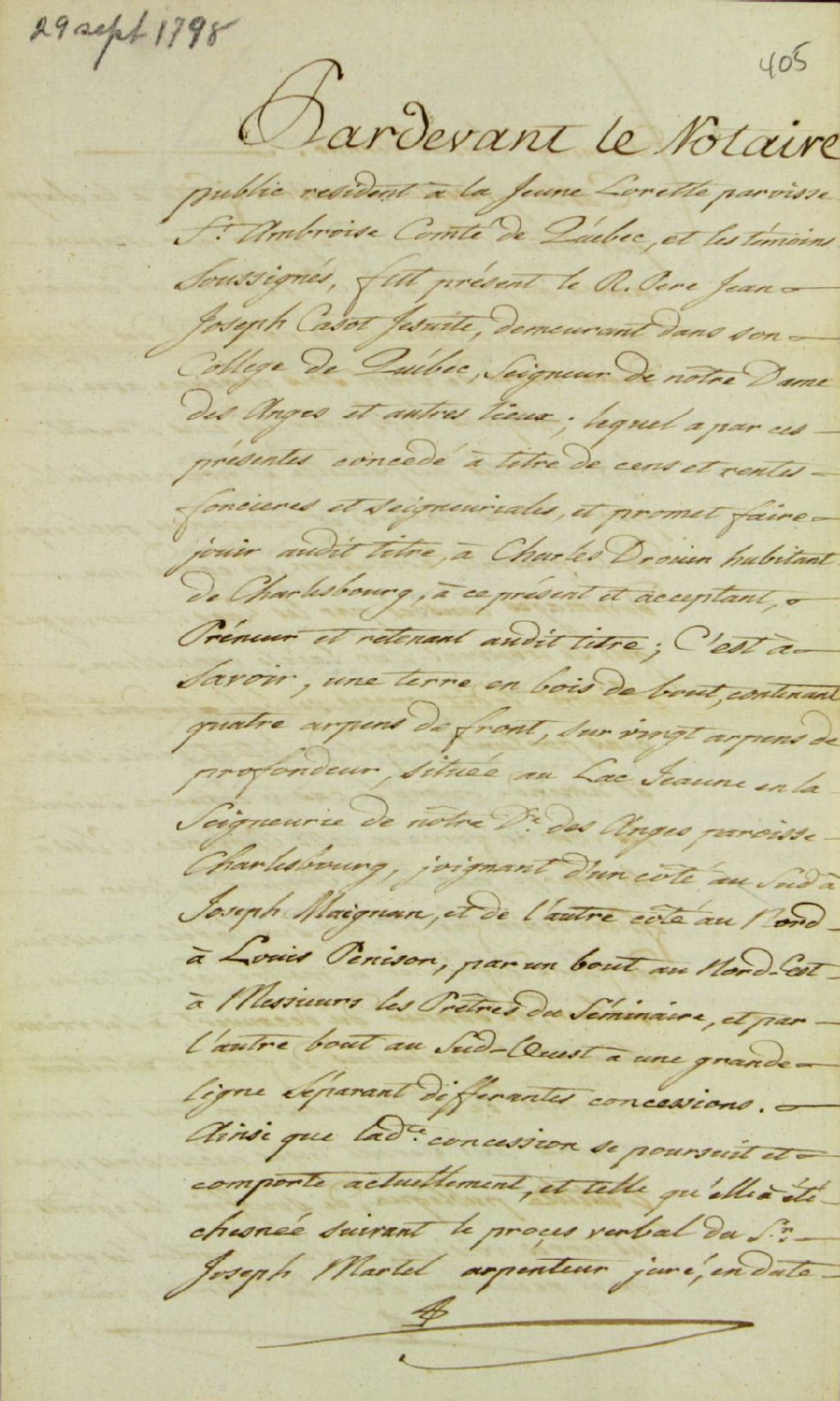 Acte de concession d'une terre en bois debout située au lac Jaune en la paroisse de Charlesbourg et en la seigneurie de Notre-Dame-des-Anges par le Révérend Père Jean-Joseph Casot, Jésuite, demeurant dans son collège de Québec, seigneur de ladite seigneurie et autres lieux, à Charles Drouin, habitant de Charlesbourg, par-devant Jean-Baptiste Panet, notaire public, 29 septembre 1798, Archives nationales à Québec, Fonds Ministère des Terres et Forêts, (03Q,E21,S64,SS5,SSS5,D405).