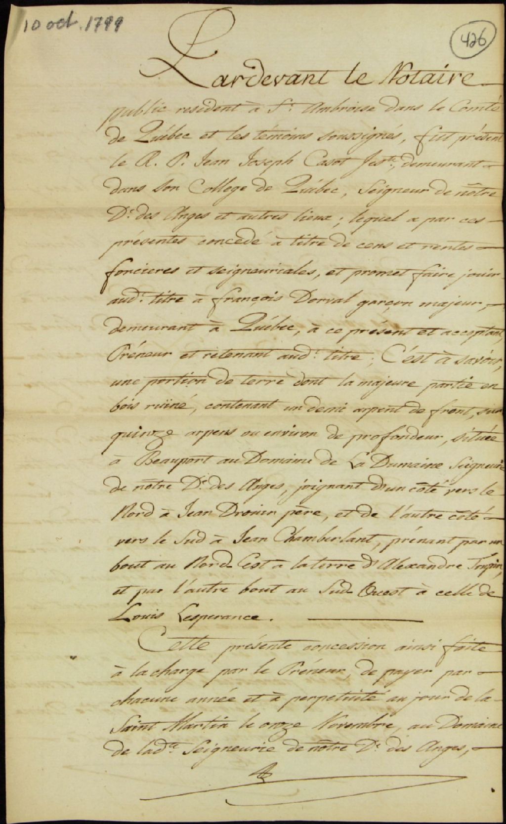 Acte de concession d'une portion de terre située à Beauport au domaine de la Dumaine en la seigneurie de Notre-Dame-des-Anges par le Révérend Père Jean-Joseph Casot, Jésuite, demeurant dans son collège de Québec, seigneur de ladite seigneurie et autres lieux, à François Dorval, garçon majeur, demeurant à Québec, par-devant Jean-Baptiste Panet, notaire public, 10 octobre 1799, Archives nationales à Québec, Fonds Ministère des Terres et Forêts, (03Q,E21,S64,SS5,SSS5,D426).