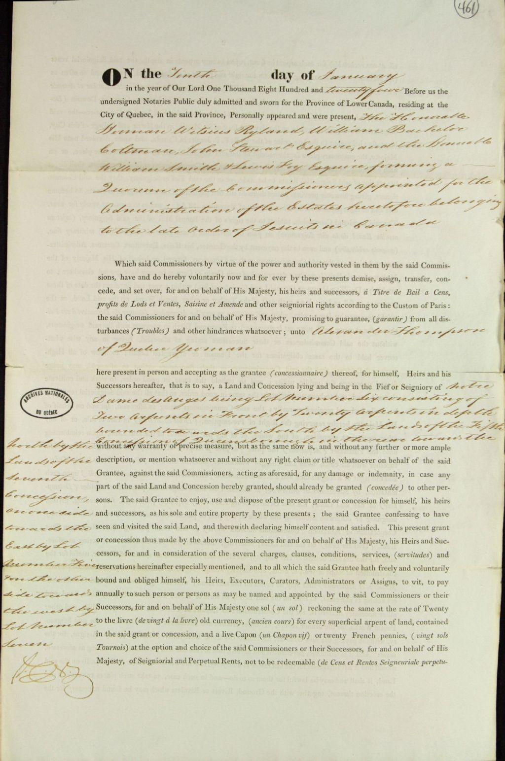 Acte de concession du lot numéro six du fief ou seigneurie de Notre-Dame-des-Anges par les commissaires responsables de l'administration des biens ayant appartenu à l'ordre des Jésuites au Canada à Alexander Thompson, cultivateur, de Québec, par-devant les notaires publics, 10 janvier 1824 (1825?), Archives nationales à Québec, Fonds Ministère des Terres et Forêts, (03Q,E21,S64,SS5,SSS5,D461).