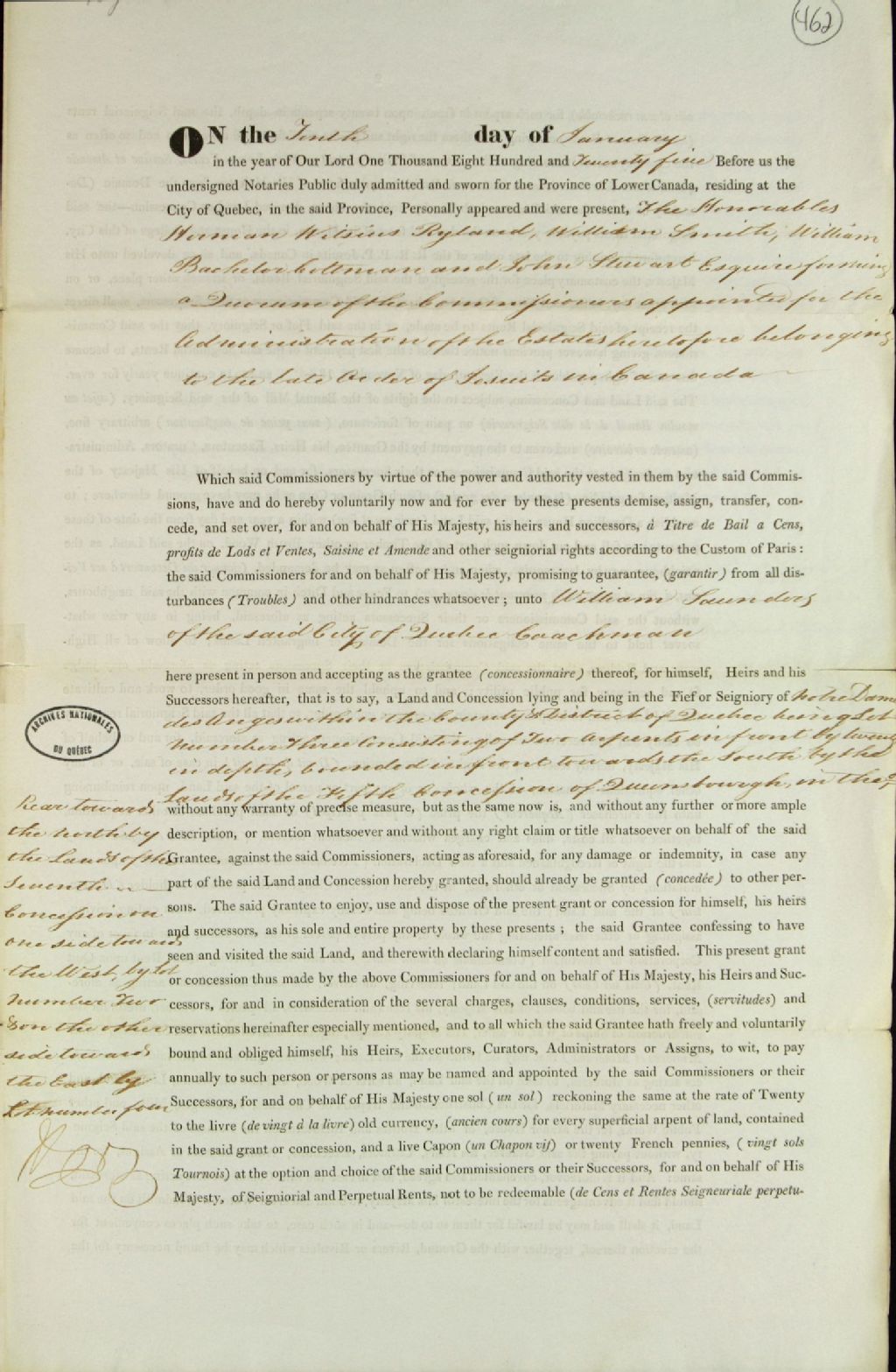 Acte de concession du lot numéro trois du fief ou seigneurie de Notre-Dame-des-Anges par les commissaires responsables de l'administration des biens ayant appartenu à l'ordre des Jésuites au Canada à William Saunders, cocher, de la ville de Québec, par-devant les notaires publics, 10 janvier 1825, Archives nationales à Québec, Fonds Ministère des Terres et Forêts, (03Q,E21,S64,SS5,SSS5,D462).