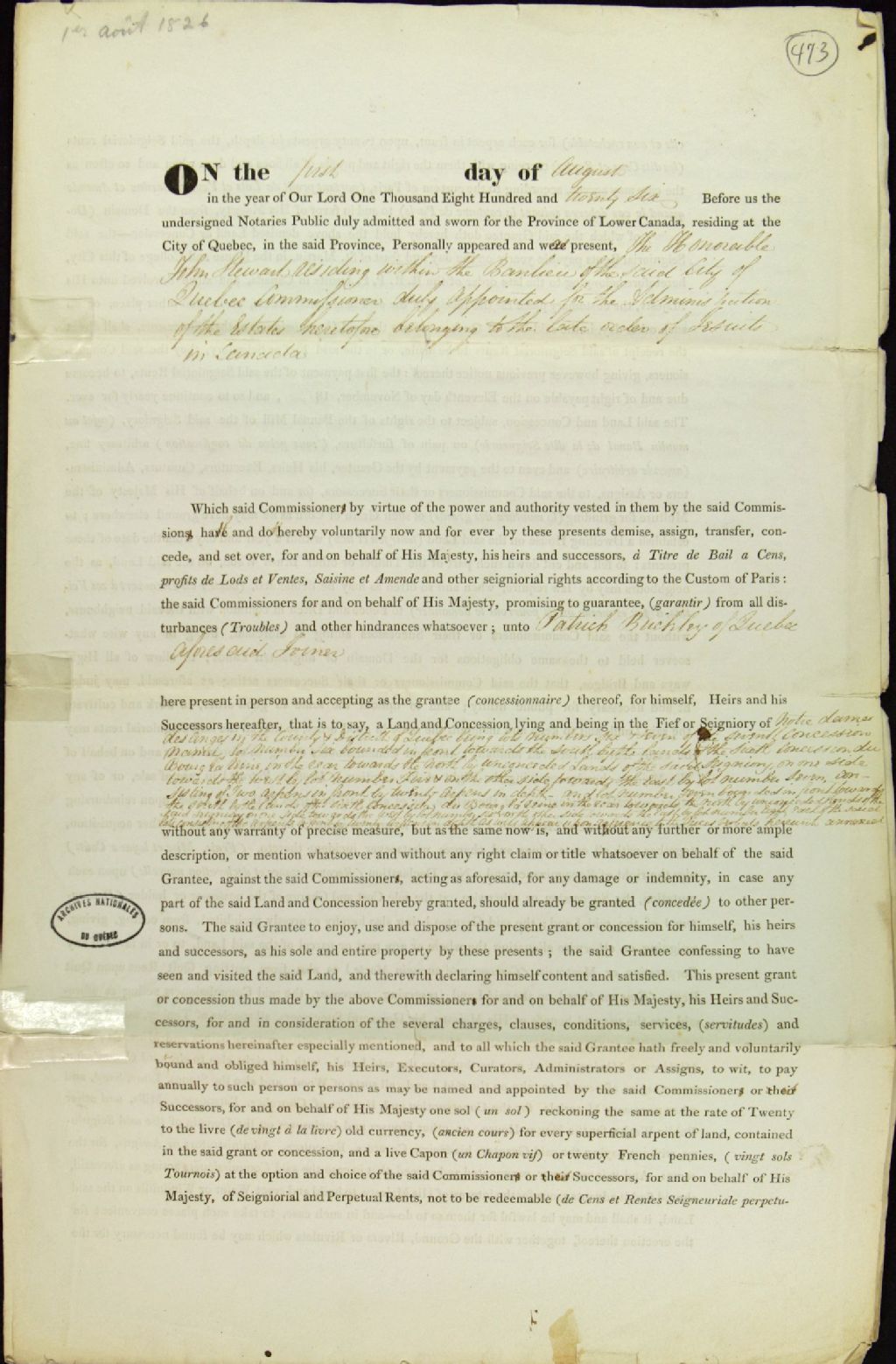 Acte de concession des lots numéro six et numéro sept dans la septième concession du fief ou seigneurie de Notre-Dame-des-Anges par l'Honorable John Stewart, demeurant dans la banlieue de la ville de Québec, commissaire responsable de l'administration des biens ayant appartenu à l'ordre des Jésuites au Canada, à Patrick Buckley, fermier, de Québec, par-devant les notaires publics, 1er août 1826, Archives nationales à Québec, Fonds Ministère des Terres et Forêts, (03Q,E21,S64,SS5,SSS5,D473).