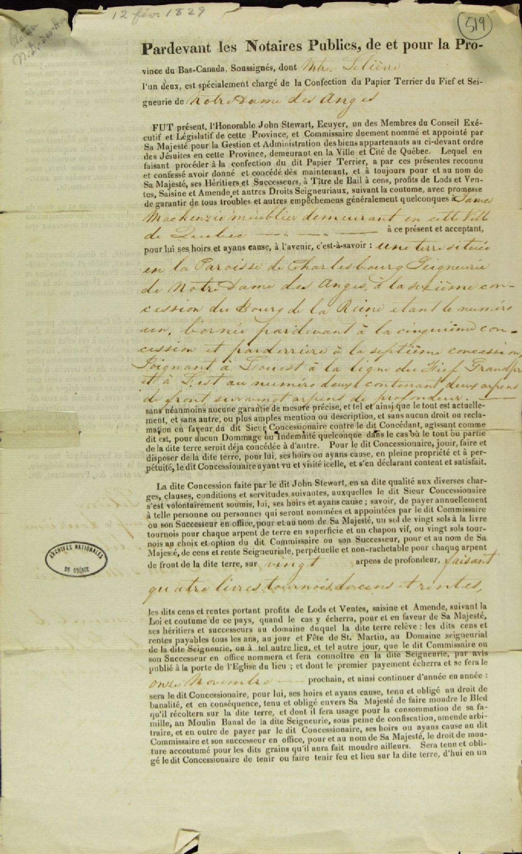 Acte de concession du lot numéro un dans la sixième concession du Bourg-la-Reine, en la paroisse de Charlesbourg et en la seigneurie de Notre-Dame-des-Anges, par l'Honorable John Stewart, écuyer, membre du Conseil exécutif et législatif de la province du Bas-Canada, commissaire responsable de la gestion et de l'administration des biens ayant appartenu à l'ordre des Jésuites, à James Mackenzie, meublier, demeurant en la ville de Québec, par-devant les notaires publics, dont maître Lelièvre, l'un d'eux, est spécialement chargé de la confection du papier terrier du fief et seigneurie de Notre-Dame-des-Anges
