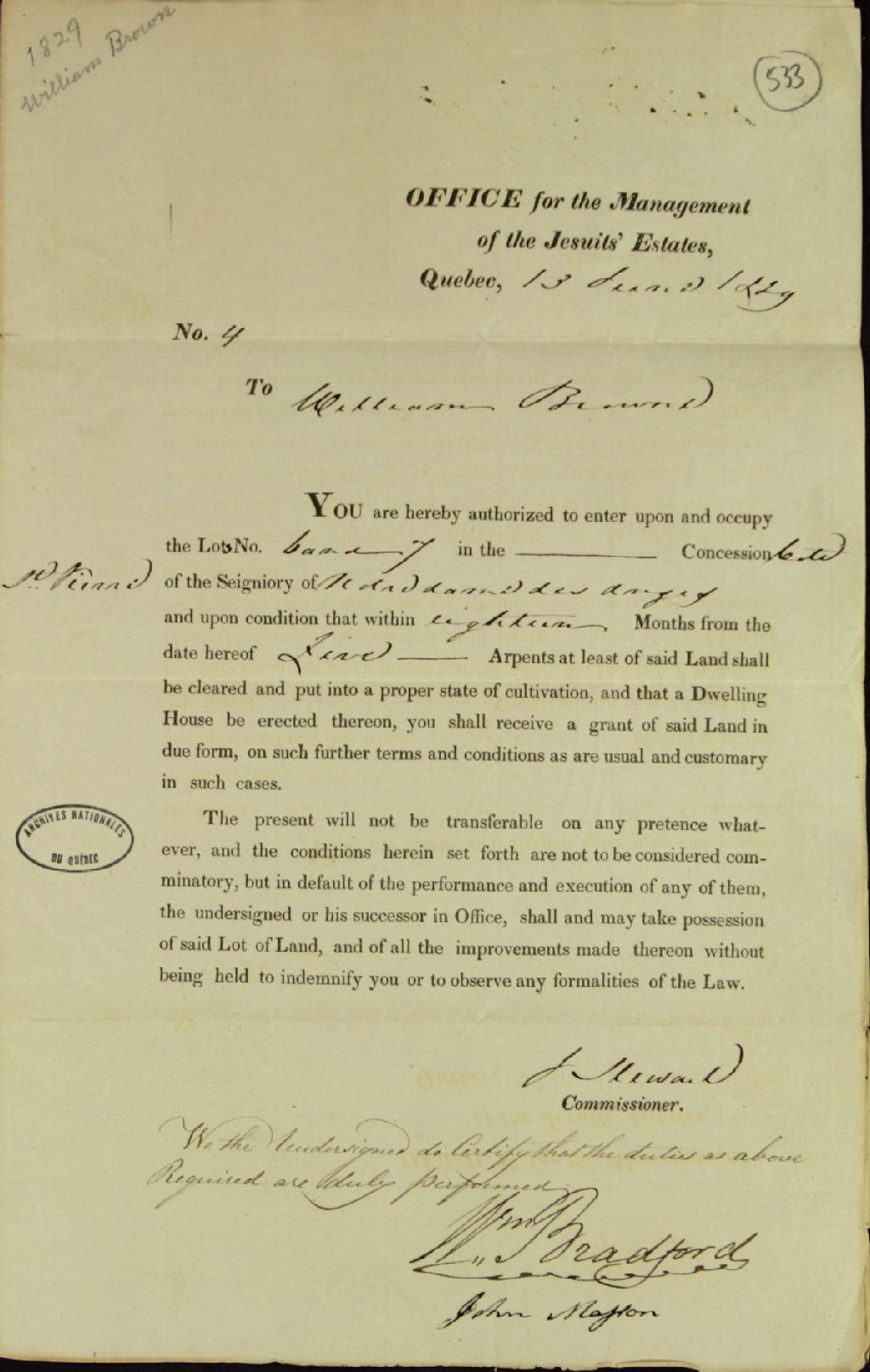 Billet de concession des lots numéro six et numéro sept dans la concession de Saint-Pierre en la seigneurie de Notre-Dame-des-Anges par John Stewart, commissaire responsable de la gestion des biens ayant appartenu à l'ordre des Jésuites, à William Browne (Brown), avec l'obligation pour ledit Browne d'avoir défriché au moins cinq arpents de ladite terre dans dix-huit mois et d'y avoir construit une maison, 13 juin 1829, Archives nationales à Québec, Fonds Ministère des Terres et Forêts, (03Q,E21,S64,SS5,SSS5,D533).