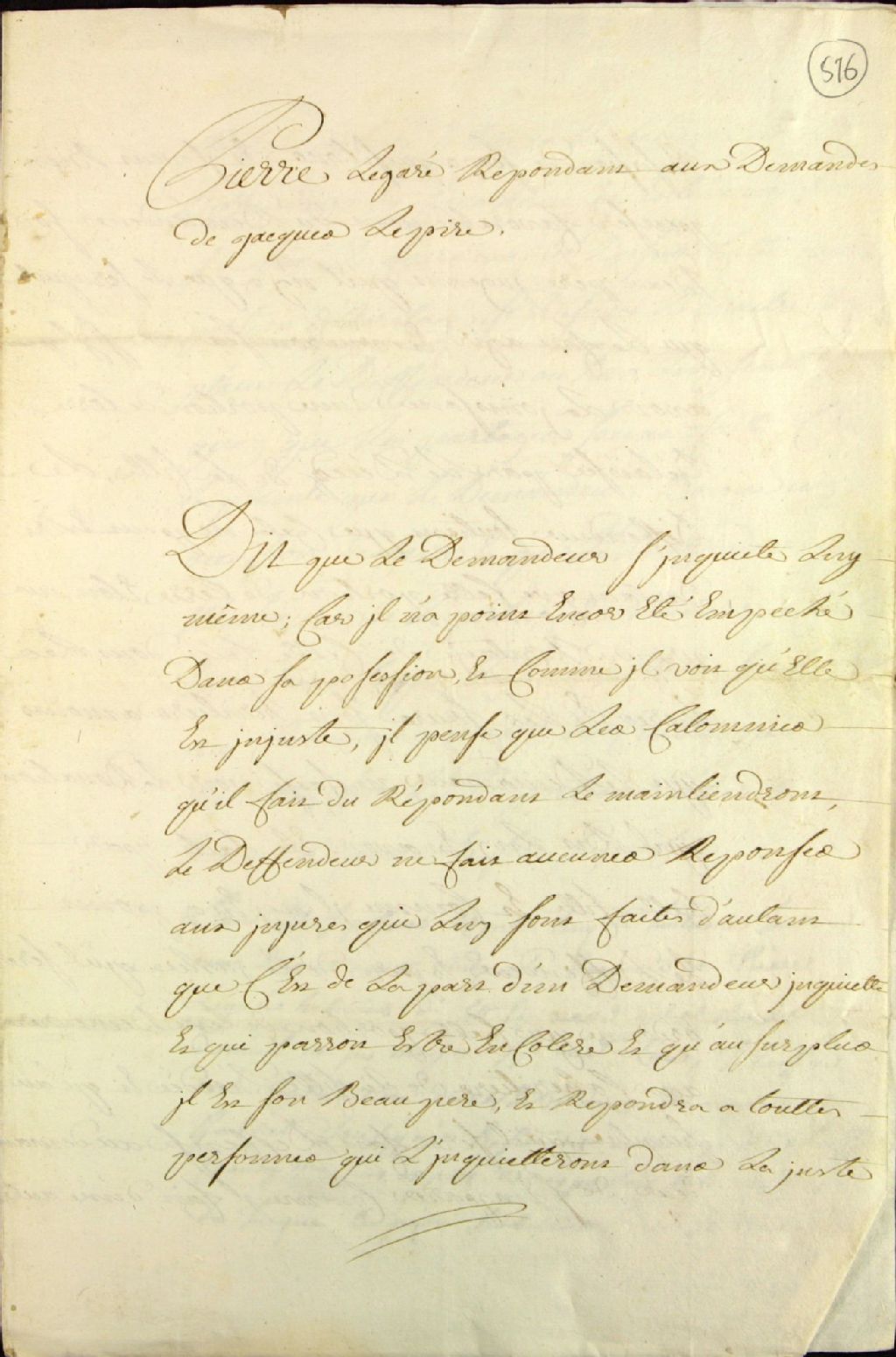 - Réponses de Pierre Légaré, défendeur, aux demandes de Jacques Lepire, son beau-père, demandeur, dans le litige les opposant au sujet de deux portions de terre dépendant de la succession (héritage) de la défunte femme dudit Légaré, fille dudit Lepire