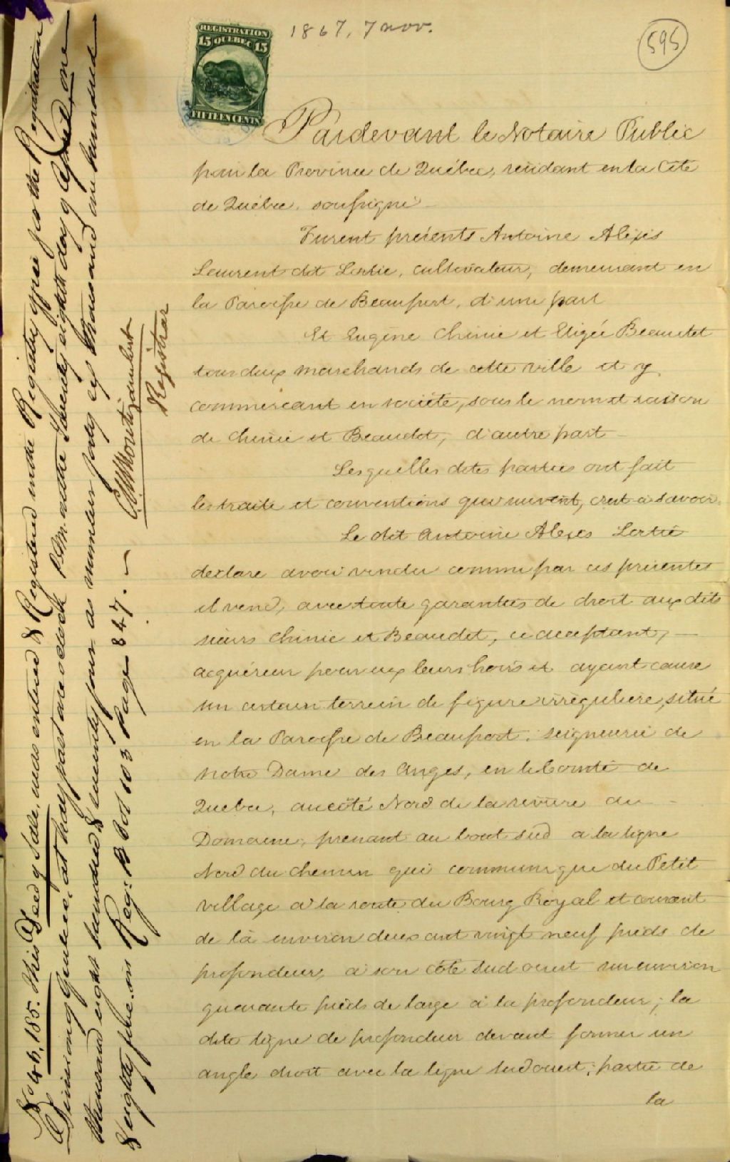 Contrat de vente d'une terre de forme irrégulière située en la paroisse de Beauport en la seigneurie de Notre-Dame-des-Anges par Antoine-Alexis Laurent dit Lortie, cultivateur, demeurant en ladite paroisse de Beauport, à Eugène Chinic et Élisée Beaudet, tous deux marchands de Québec, y commerçant en société sous le nom et raison de Chinic et Beaudet, par-devant maître Samuel-Isidore Glackemeyer, notaire public pour la province de Québec, 7 novembre 1867, Archives nationales à Québec, Fonds Ministère des Terres et Forêts, (03Q,E21,S64,SS5,SSS5,D595).