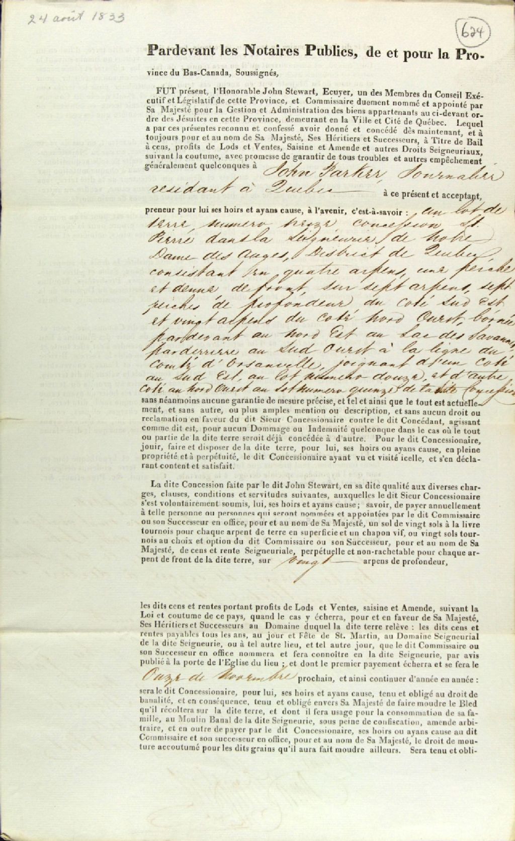 Acte de concession du lot de terre numéro treize dans la concession de Saint-Pierre dans la seigneurie de Notre-Dame-des-Anges par l'Honorable John Stewart, écuyer, membre du Conseil exécutif et législatif de la province du Bas-Canada, commissaire responsable de la gestion et de l'administration des biens ayant appartenu aux Jésuites, au nom de Sa Majesté, à John Parker, journalier, résidant à Québec, par-devant les notaires publics, 24 août 1833, Archives nationales à Québec, Fonds Ministère des Terres et Forêts, (03Q,E21,S64,SS5,SSS5,D624).