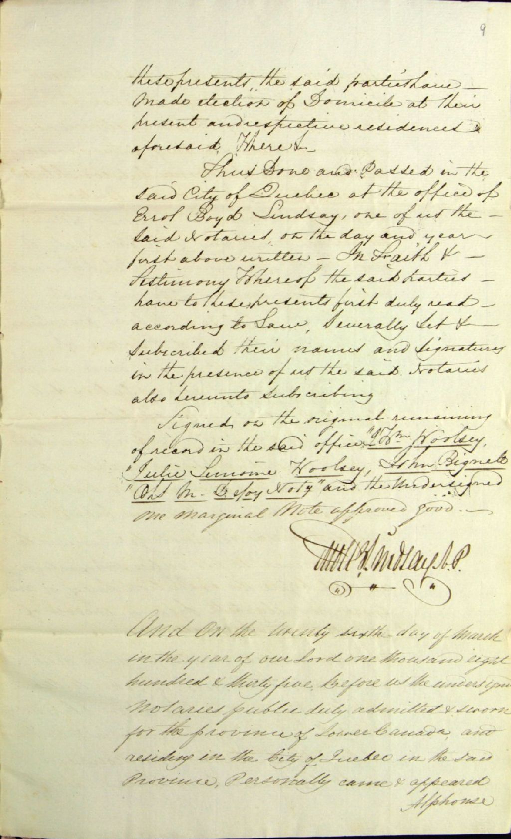 Quittance de Melchior-Alphonse de Salaberry, écuyer, de la paroisse de Saint-Joseph-de-Chambly, extra aide de camp de Son Excellence Lord Aylmer, gouverneur en chef de la province du Bas-Canada, en sa qualité de procureur de dame Marie-Anne-Julie Hertel de Rouville, sa mère, veuve de l'Honorable Charles-Michel de Salaberry, résidant en ladite paroisse, tant en son nom que comme tutrice de ses enfants mineurs, en faveur de dame Elizabeth Brown, veuve de John Bignell, écuyer, ledit sieur de Salaberry reconnaissant avoir reçu de ladite dame Brown la somme de deux cent vingt-cinq livres, huit shillings et trois pence par elle due en vertu du contrat de vente d'une terre passé entre son défunt mari et John William Woolsey, 26 mars 1835, Archives nationales à Québec, Fonds Ministère des Terres et Forêts, (03Q,E21,S64,SS5,SSS5,D631-2).