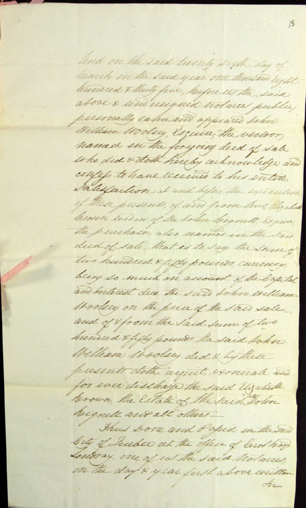Quittance de John William Woolsey, écuyer, en faveur de dame Elizabeth Brown, veuve de John Bignell, écuyer, ledit sieur Woolsey reconnaissant avoir reçu de ladite dame Brown la somme de deux cent cinquante livres par elle due en vertu du contrat de vente d'une terre passé entre son défunt mari et ledit sieur Woolsey, 26 mars 1835, Archives nationales à Québec, Fonds Ministère des Terres et Forêts, (03Q,E21,S64,SS5,SSS5,D631-4).