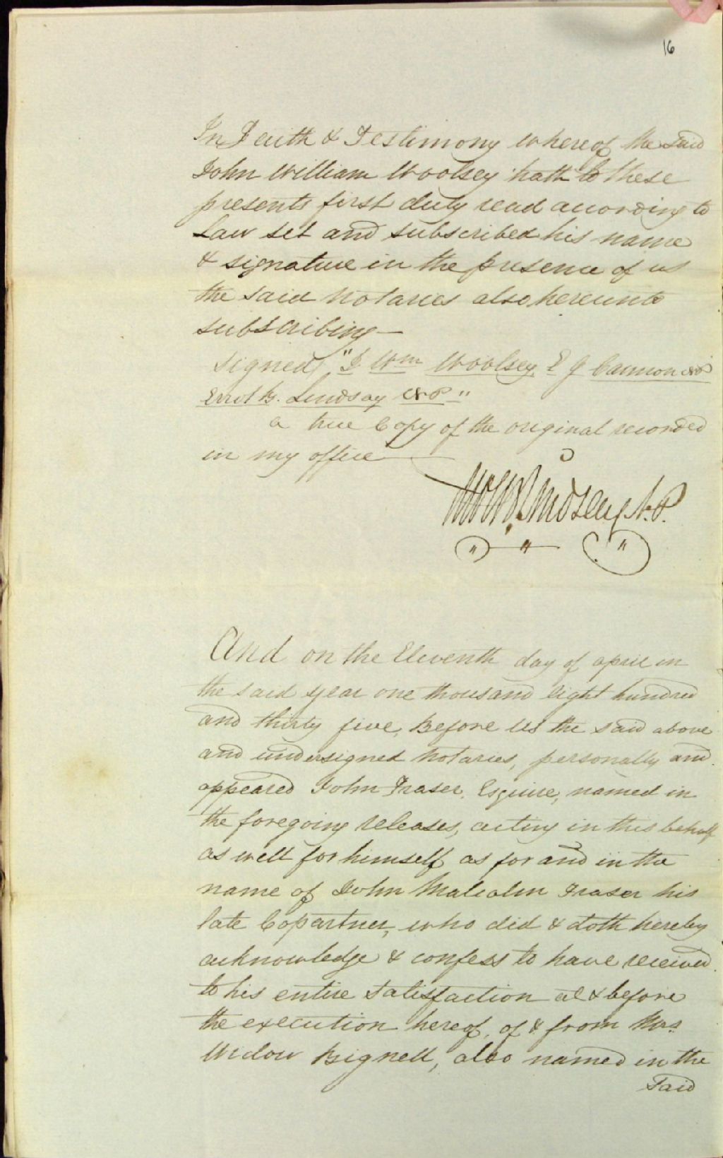 Quittance de John Fraser, écuyer, faisant tant en son nom que pour John Malcolm Fraser, son ancien partenaire, en faveur de dame Elizabeth Brown, veuve de John Bignell, ledit sieur Fraser reconnaissant avoir reçu de ladite dame Brown la somme de quatre-vingt-huit livres, treize shillings et neuf pence pour le solde de la somme due auxdits sieurs Fraser en tant que représentants de Jean-Baptiste-René Hertel de Rouville, écuyer, 11 avril 1835, Archives nationales à Québec, Fonds Ministère des Terres et Forêts, (03Q,E21,S64,SS5,SSS5,D631-5).