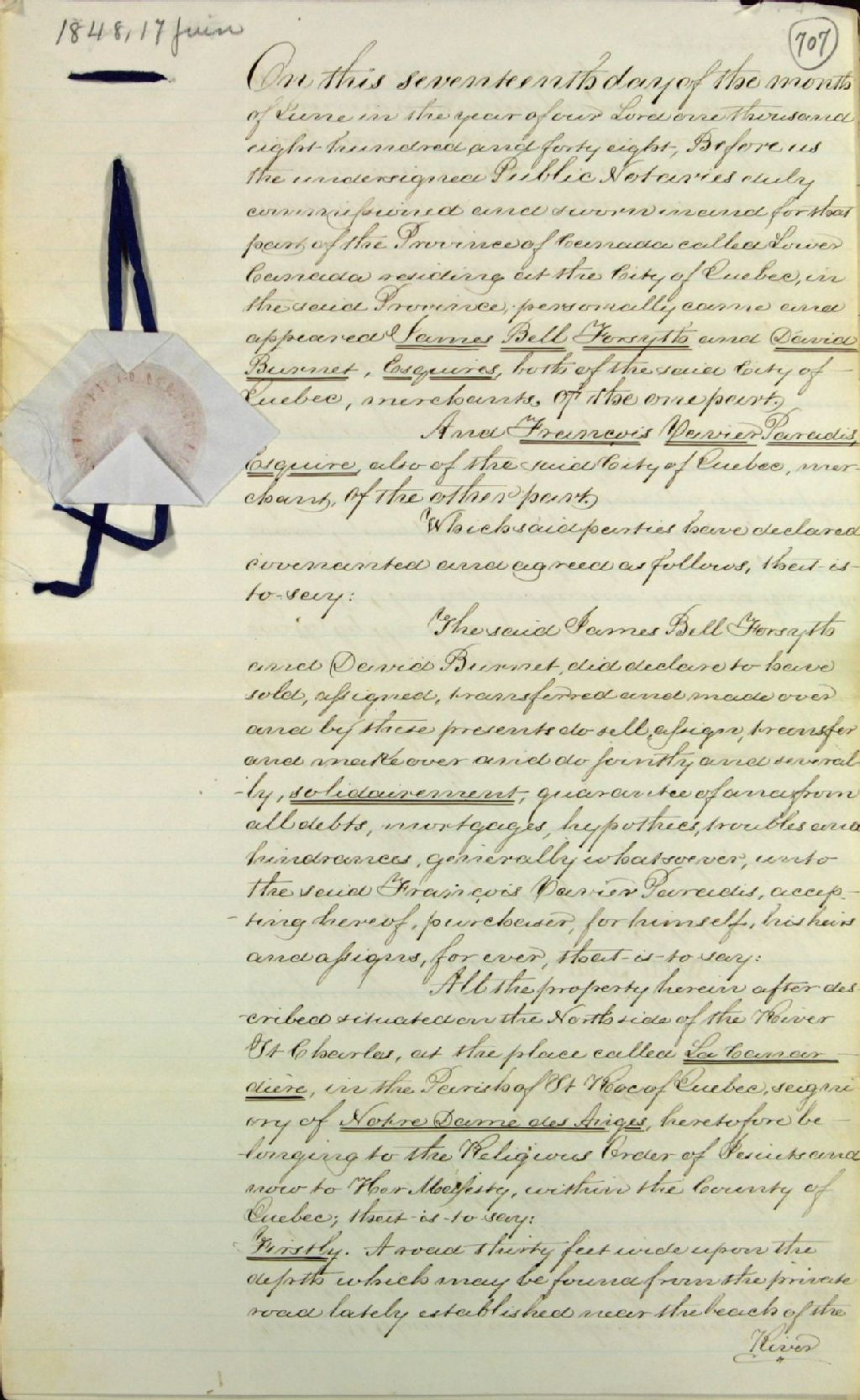 Contrat de vente de terres, propriétés et objets situés sur la rive nord de la rivière Saint-Charles à la Canardière, dans la paroisse Saint-Roch de Québec, dans la seigneurie de Notre-Dame-des-Anges, appartenant ci-devant aux Jésuites et maintenant dévolue à Sa Majesté, par James Bell Forsyth et David Burnett, écuyers, tous deux marchands de la ville de Québec, à François-Xavier Paradis, écuyer, aussi marchand de ladite ville, par-devant les notaires publics