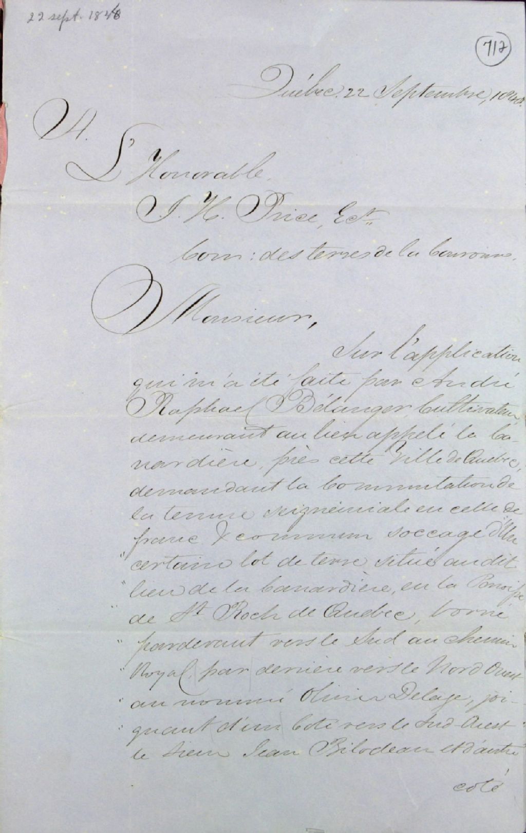 Rapport à l'attention de l'Honorable James Hervey Price, écuyer, commissaire des terres de la Couronne, à la suite de la requête présentée par André-Raphaël Bélanger, cultivateur, demeurant à la Canardière près de la ville de Québec, dans le but d'obtenir la commutation de la tenure seigneuriale en celle de franc et commun socage d'un certain lot de terre situé audit lieu de la Canardière en la paroisse de Saint-Roch à Québec, 22 septembre 1848, Archives nationales à Québec, Fonds Ministère des Terres et Forêts, (03Q,E21,S64,SS5,SSS5,D712).