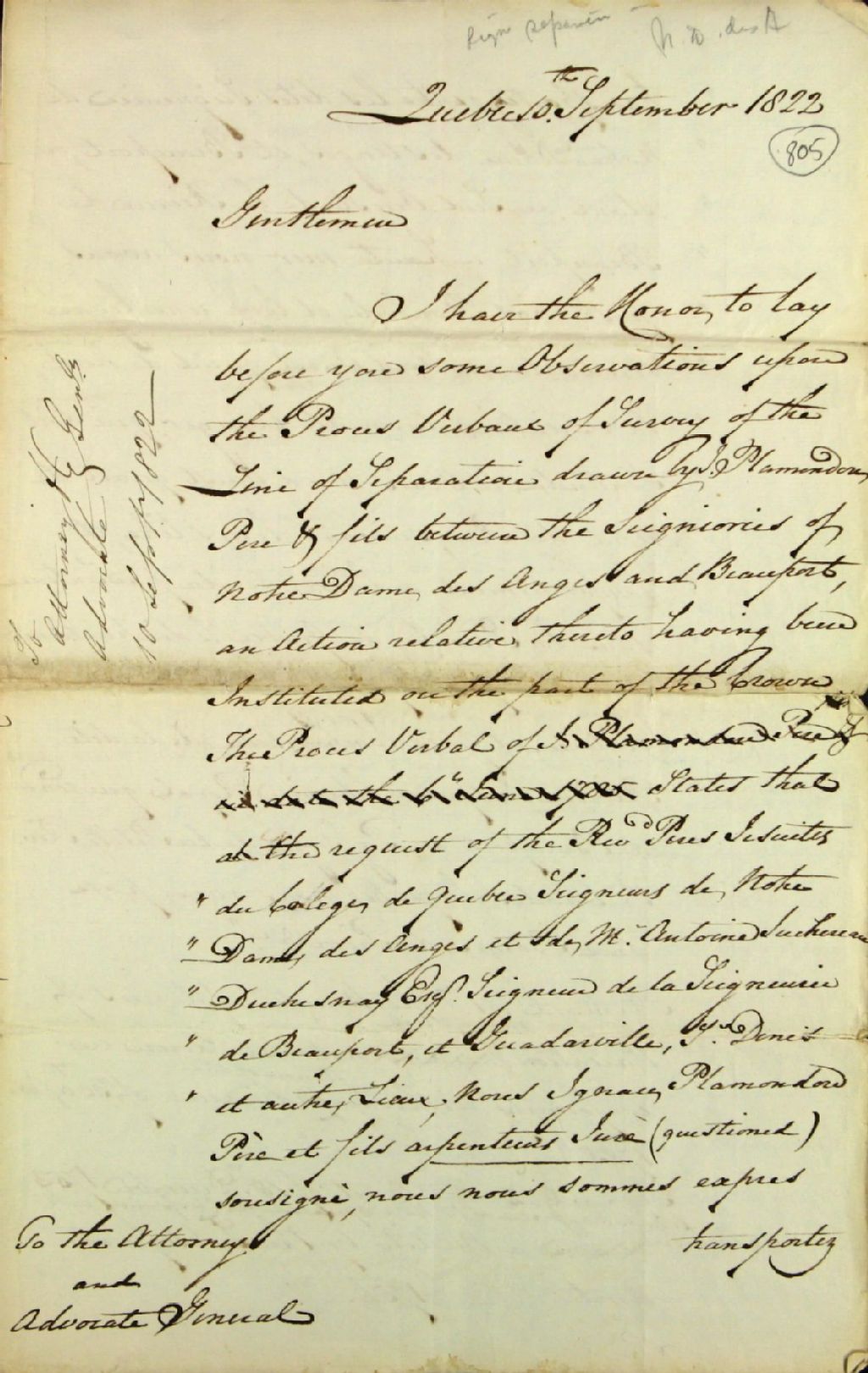 Lettre non signée au procureur général et à l'avocat général [George Vanfelson] qui présente le témoignage des arpenteurs Ignace Plamondon (père et fils) dans le cadre du procès visant à déterminer la limite des seigneuries Notre-Dame-des-Anges et de Beauport, 10 septembre 1822, Archives nationales à Québec, Fonds Ministère des Terres et Forêts, (03Q,E21,S64,SS5,SSS5,D805).