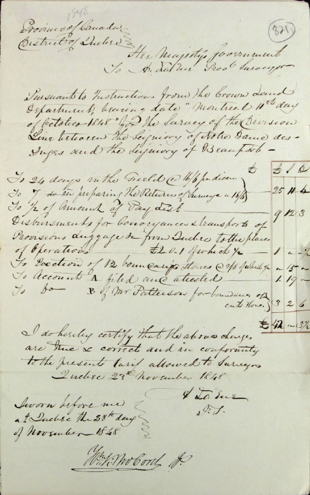 Compte de dépenses et liste de paie des employés de l'arpentage du territoire délimitant les seigneuries Notre-Dame-des-Anges et de Beauport. Les documents sont présentés par Adolphe Larue, arpenteur de la province, au gouvernement du district de Québec. Ils sont contresignés par William King McCord, fonctionnaire