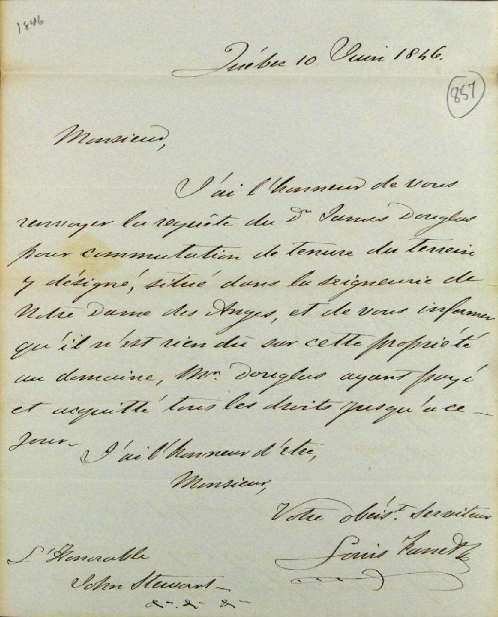 Lettre de Louis Panet [agent] à John Stewart, membre de la commission responsable de l'administration des biens des Jésuites, à propos de la requête du docteur James Douglas pour la commutation de tenure d'un terrain situé dans la seigneurie Notre-Dame-des-Anges, 10 juin 1846, Archives nationales à Québec, Fonds Ministère des Terres et Forêts, (03Q,E21,S64,SS5,SSS5,D857).