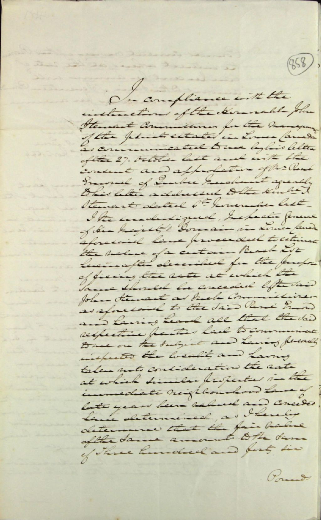 Lettre de F. Primrose, inspecteur général du domaine de la reine, qui présente, à la demande de John Stewart, membre de la commission responsable de l'administration des biens des Jésuites, une estimation de la valeur du lot situé en bordure de la plage de la seigneurie Notre-Dame-des-Anges. À l'endos du document, une note informe que les droits de cette concession ont été cédés à Horatio Nelson (?) Jones, 2 décembre 1845 - 15 juillet 1846, Archives nationales à Québec, Fonds Ministère des Terres et Forêts, (03Q,E21,S64,SS5,SSS5,D858).