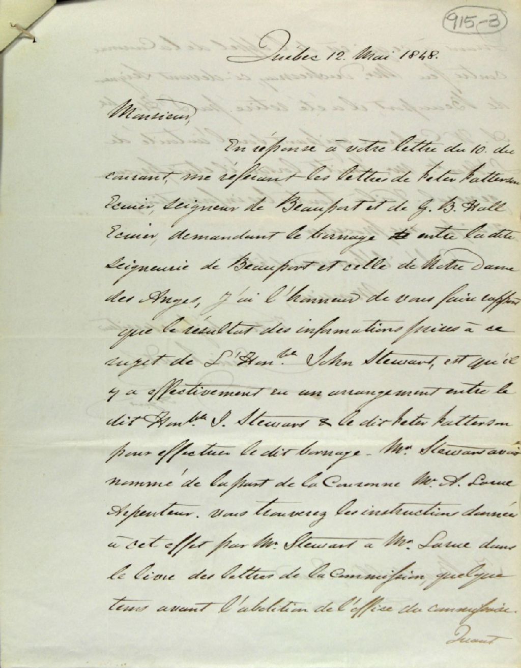 Lettre de Louis Panet, agent, à G. Bouthiller, écuyer et assistant commissaire des terres de la Couronne, qui confirme qu'il y a eu un arrangement entre John Stewart et Peter Patterson pour effectuer le bornage entre les seigneuries Notre-Dame-des-Anges et de Beauport. Larue avait été nommé arpenteur de la part de la Couronne et les instructions données par John Stewart se retrouvent dans le livre des lettres de la commission, quelques temps avant l'abolition de l'office du commissaire. On mentionne également que l'acte décrivant l'appel de la Couronne contre feu Duchesnay, propriétaire de la seigneurie de Beauport, a été retiré par A. W. Cochran (Cochrane) agissant sous l'autorité de W. Smith, alors procureur général, 12 mai 1848, Archives nationales à Québec, Fonds Ministère des Terres et Forêts, (03Q,E21,S64,SS5,SSS5,D915-3).