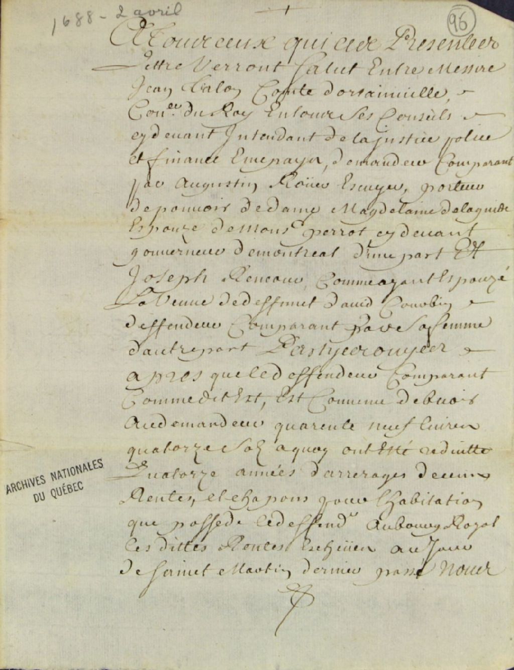 Jugement rendu en faveur de messire Jean Talon, comte d'Orsainville, conseiller du Roi en ses Conseils, ci-devant intendant de justice, police et finances, comparant par Augustin Rouer, écuyer, porteur du pouvoir de dame Madeleine Laguide, épouse de monsieur Perrault (Perrot), ci-devant gouverneur de Montréal, par René-Louis Chartier, écuyer, seigneur de Lotbinière, conseiller du Roi et son lieutenant général civil et criminel au siège de la Prévôté de Québec, dans la cause concernant le non paiement des cens et rente d'une habitation située au Bourg-Royal l'opposant à Joseph Rancourt (Rancour), comme ayant épousé la veuve du défunt David Corbin, comparant par sa femme