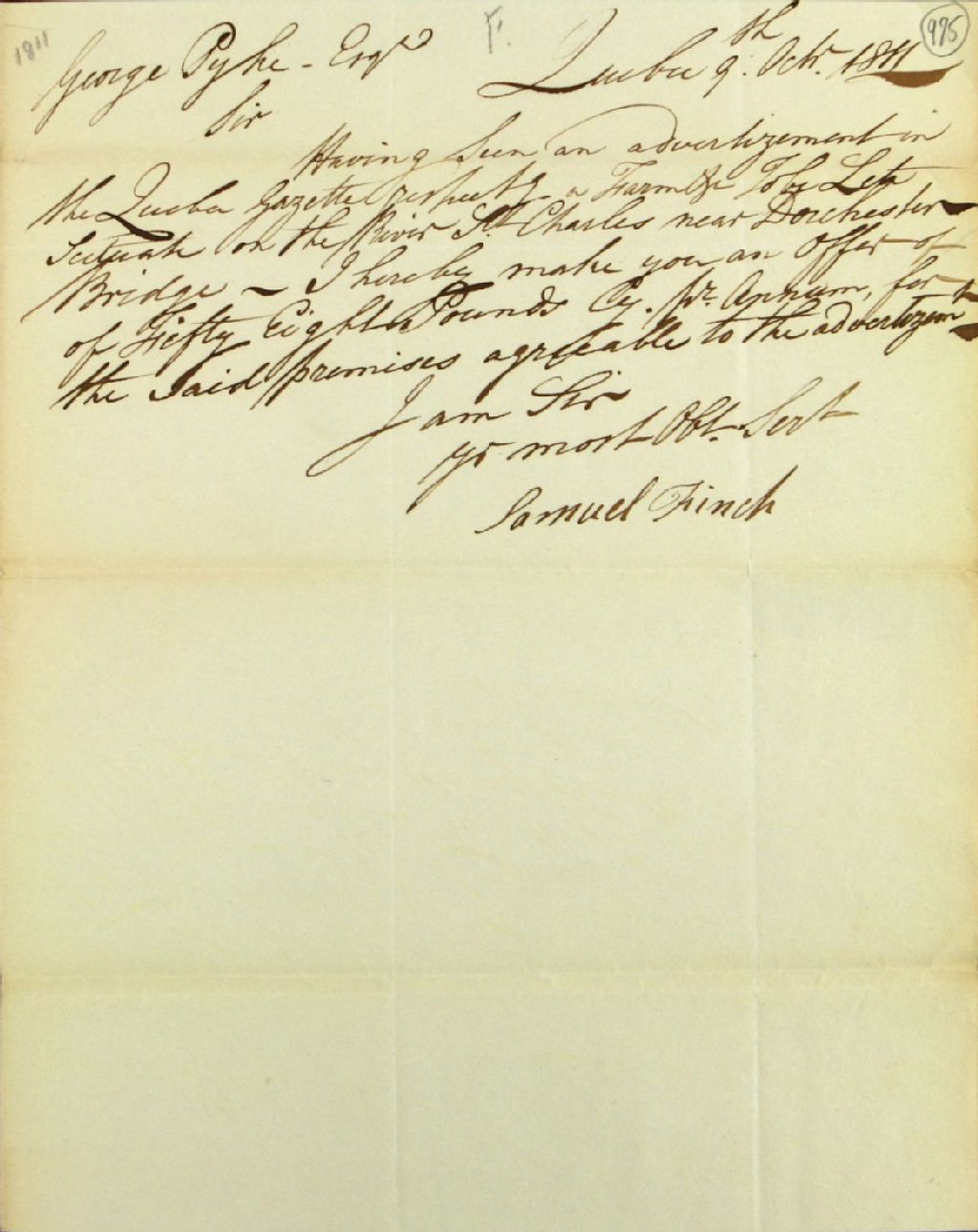Proposition de location de la ferme des Jésuites située près du pont Dorcherster, par Samuel Finch à George Pyke, secrétaire à la Commission des biens des Jésuites, 9 octobre 1811, Archives nationales à Québec, Fonds Ministère des Terres et Forêts, (03Q,E21,S64,SS5,SSS5,D975).