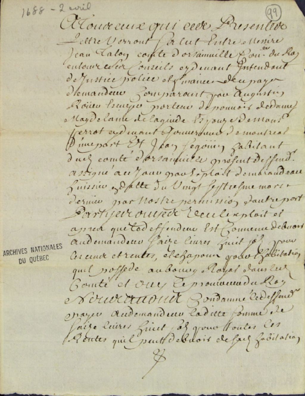 Jugement rendu en faveur de messire Jean Talon, comte d'Orsainville, conseiller du Roi en ses Conseils, ci-devant intendant de justice, police et finances, comparant par Augustin Rouer, écuyer, porteur du pouvoir de dame Madeleine Laguide, épouse de monsieur Perrault (Perrot), ci-devant gouverneur de Montréal, par René-Louis Chartier, écuyer, seigneur de Lotbinière, conseiller du Roi et son lieutenant général civil et criminel au siège de la Prévôté de Québec, dans la cause concernant le non paiement des cens et rente d'une habitation située au Bourg-Royal l'opposant à Jean Sigouin, habitant du comté d'Orsainville