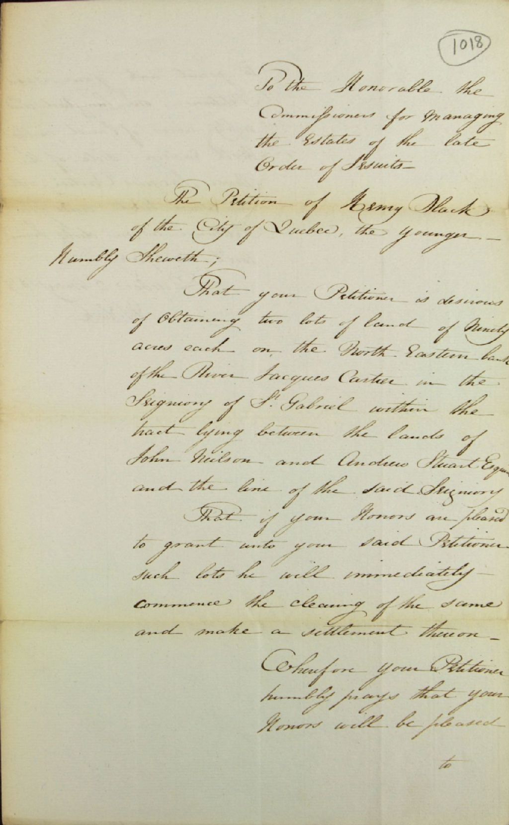 Requête de Henry Black de Québec, adressée à la commission responsable de l'administration des biens des Jésuites, afin de se faire concéder deux lots de terre sur la rive nord-est de la rivière Jacques-Cartier, entre les terres d'Andrew Stuart et John Neilson et la ligne seigneuriale de Saint-Gabriel