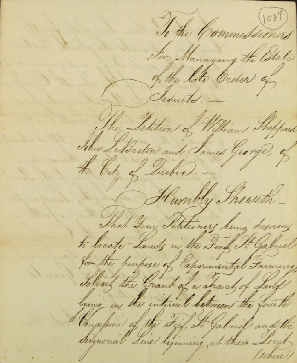 Requête de William Sheppard, John LeBreton et James George, résidants à Québec, adressée à la commission responsable de l'administration des biens des Jésuites, afin de se faire concéder des terres dans la quatrième concession du fief Saint-Gabriel, afin de pratiquer de l'agriculture expérimentale, 24 juin 1818, Archives nationales à Québec, Fonds Ministère des Terres et Forêts, (03Q,E21,S64,SS5,SSS6,D1027).