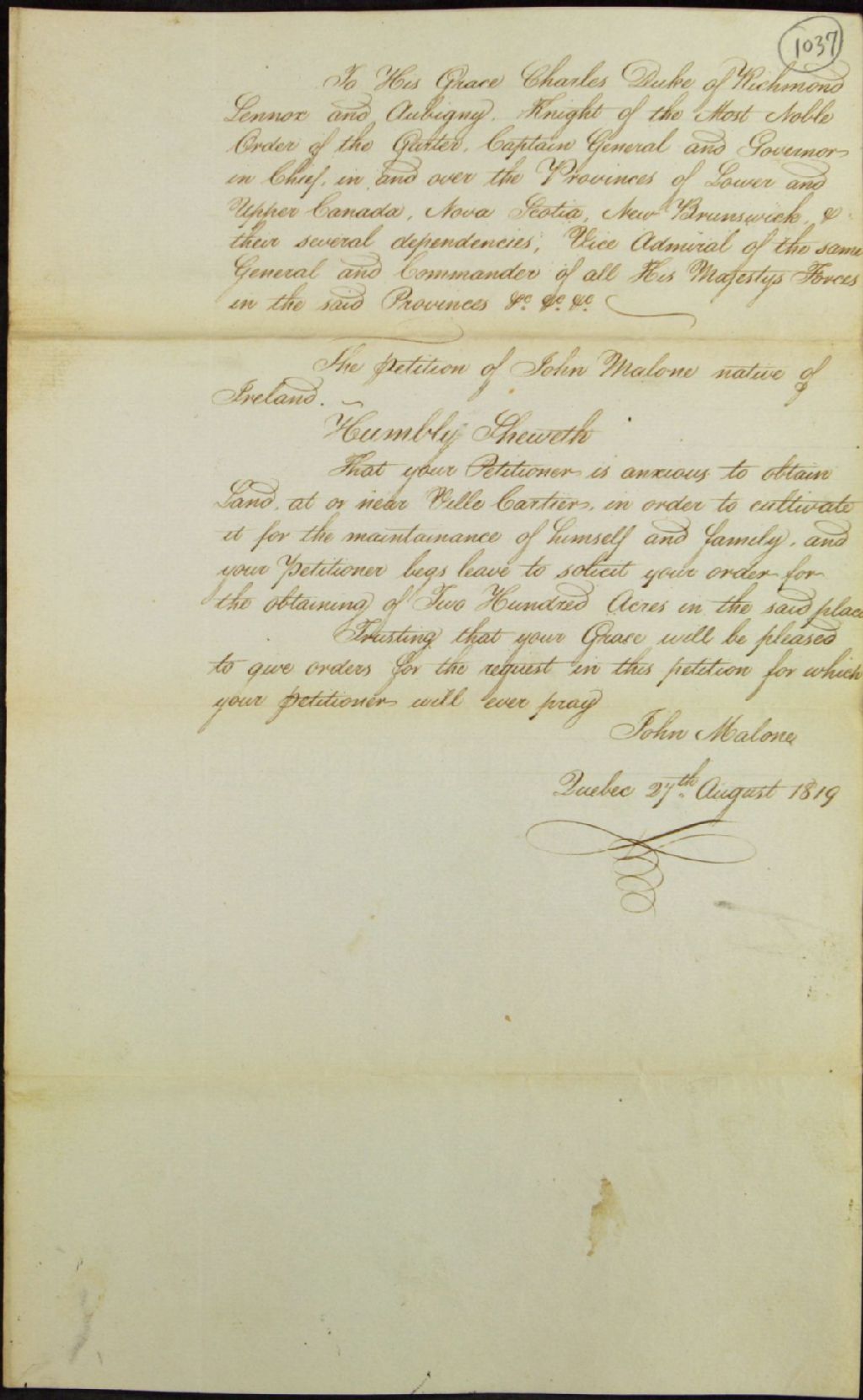 Requête de John Malone, immigrant irlandais, adressée Charles duc de Richmond, Lennox et Aubigny, gouverneur en chef des provinces du Has-Canada et du Haut-Canada, etc., afin de se faire concéder deux cents acres terres à ou près de Ville Cartier (Valcartier) [dans la seigneurie Saint-Gabriel], 24 août 1819, Archives nationales à Québec, Fonds Ministère des Terres et Forêts, (03Q,E21,S64,SS5,SSS6,D1037).