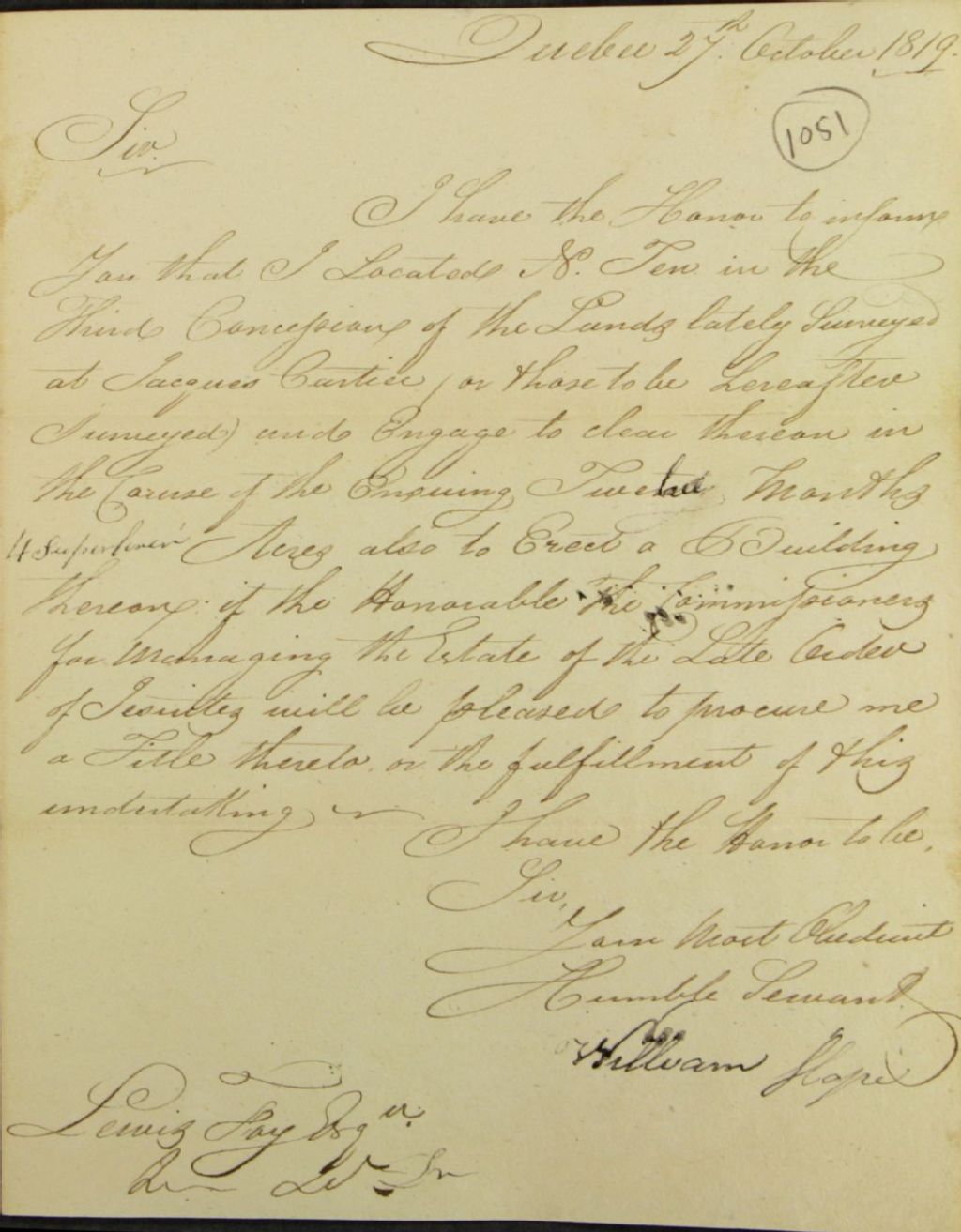 Requête de William Hope, adressée à Lewis Foy, écuyer, afin de se faire octroyer le titre de propriété du lot 10 de la troisième concession de la seigneurie Saint-Gabriel, puisqu'il affirme avoir rempli ses engagement de location de lot, 27 octobre 1819, Archives nationales à Québec, Fonds Ministère des Terres et Forêts, (03Q,E21,S64,SS5,SSS6,D1051).