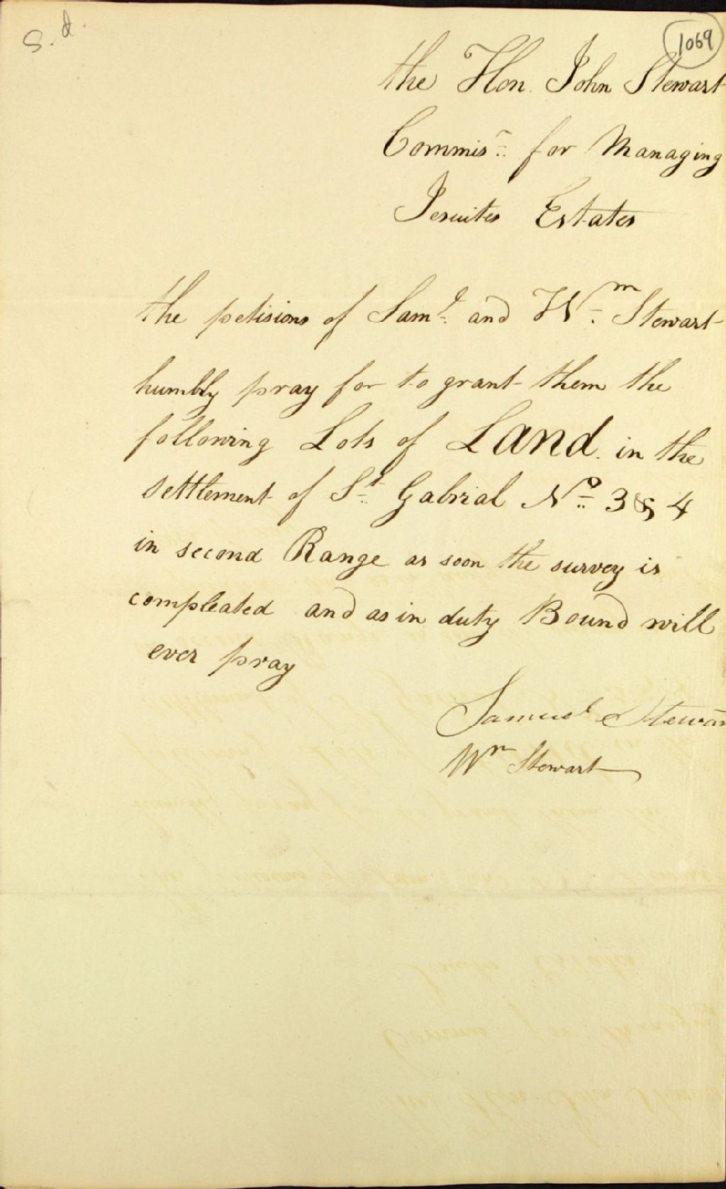 Requête de Samuel Stewart et William Stewart, adressée à la commission responsable de l'administration des biens des Jésuites, afin de se faire concéder les lots 3 et 4 dans le deuxième rang [de la seigneurie Saint-Gabriel] aussitôt que l'arpentage est terminé, 1647 - 1886, Archives nationales à Québec, Fonds Ministère des Terres et Forêts, (03Q,E21,S64,SS5,SSS6,D1069).