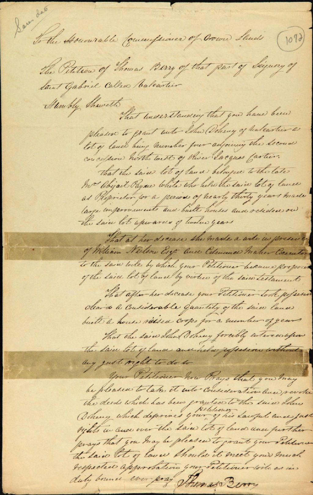 Requête de Thomas Berry de Valcartier, adressée à la commission des terres de la Couronne, concernant l'octroi du lot 4 de la quatrième concession au sord-est de la rivière Jacques-Cartier [seigneurie Saint-Gabriel] à John Doheny, lequel lot appartiendrait à Thomas Berry qui l'aurait hérité d'Abygail Payne White (Abigail Pain), et déclaration de Heny Crawford, notaire, selon laquelle les faits mentionnés dans la rquêt sont véridiques