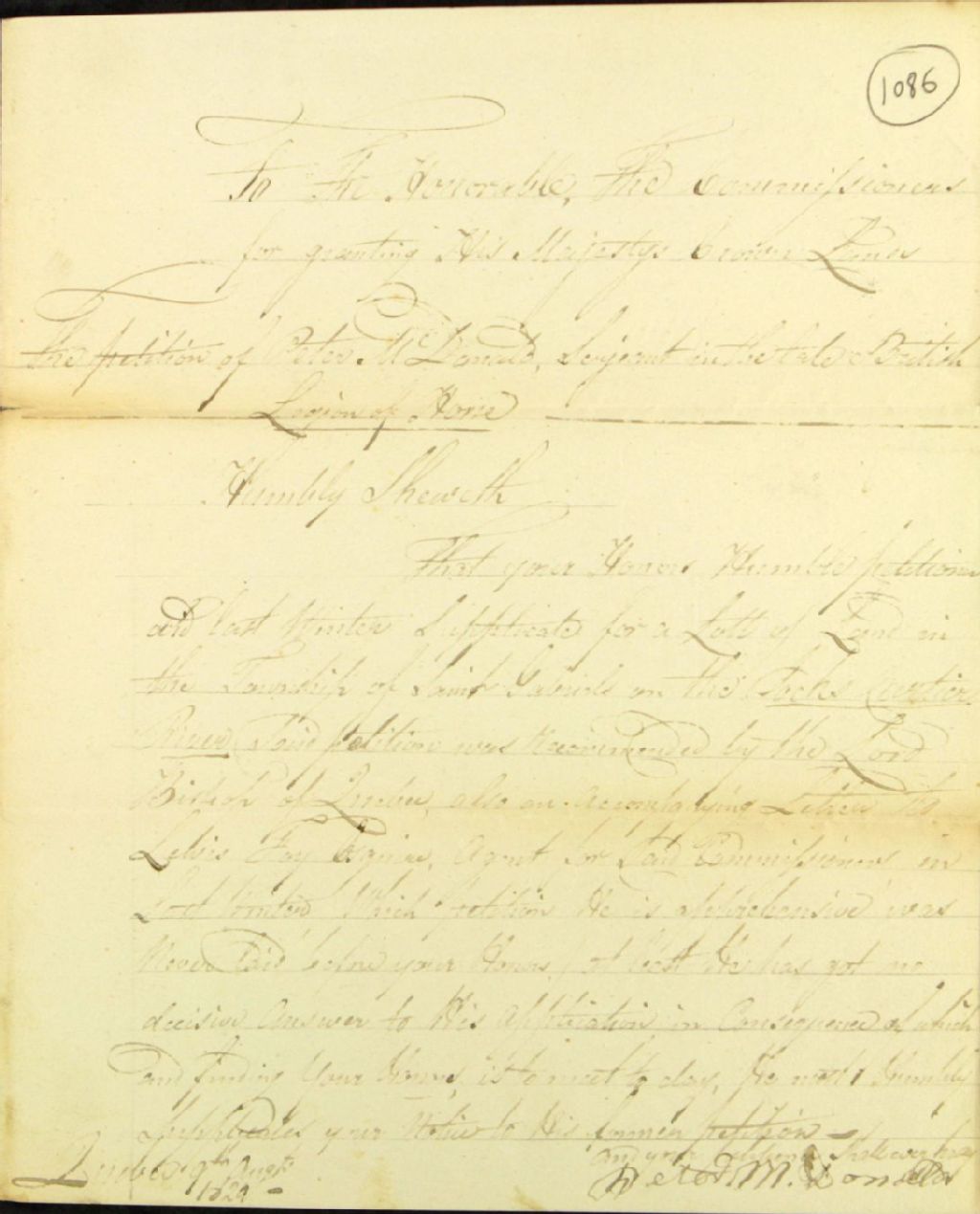 Seconde requête de Peter McDonald, ancien sergent de la légion de cavalerie britannique (British Legion of Horse), adressée à la commission responsable de l'administration des biens des Jésuites, afin de se faire concéder une terre à la rivière Jacques-Cartier (Fochs Cartier) dans la seigneurie (township) Saint-Gabriel, 9 août 1820, Archives nationales à Québec, Fonds Ministère des Terres et Forêts, (03Q,E21,S64,SS5,SSS6,D1086).