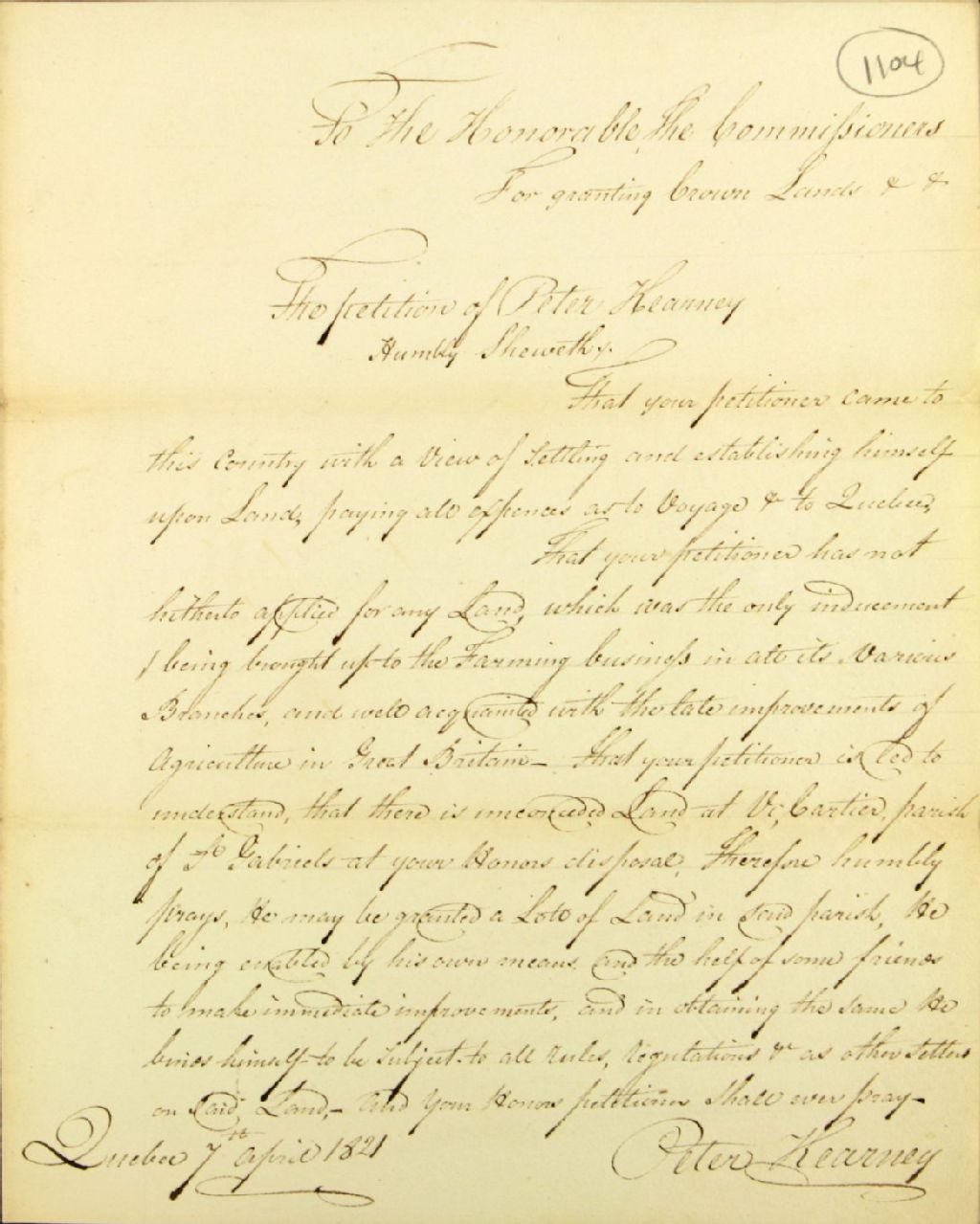 Requête de Peter Kearney, adressée à la commission responsable de l'administration des biens des Jésuites, afin de se faire concéder une terre à Valcartier, seigneurie Saint-Gabriel, 7 avril 1821, Archives nationales à Québec, Fonds Ministère des Terres et Forêts, (03Q,E21,S64,SS5,SSS6,D1104).