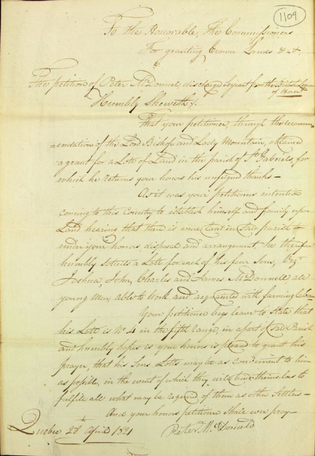 Requête de Peter McDonald (McDonnel), ancien sergent de la légion de cavalerie britannique (British Legion of Horse), adressée à la commission responsable de l'administration des biens des Jésuites, afin de se faire concéder des lots pour ses fils; il cultive déjà le lot 4 du conquième rang de la seigneurie Saint-Gabriel, 28 avril 1821, Archives nationales à Québec, Fonds Ministère des Terres et Forêts, (03Q,E21,S64,SS5,SSS6,D1109).