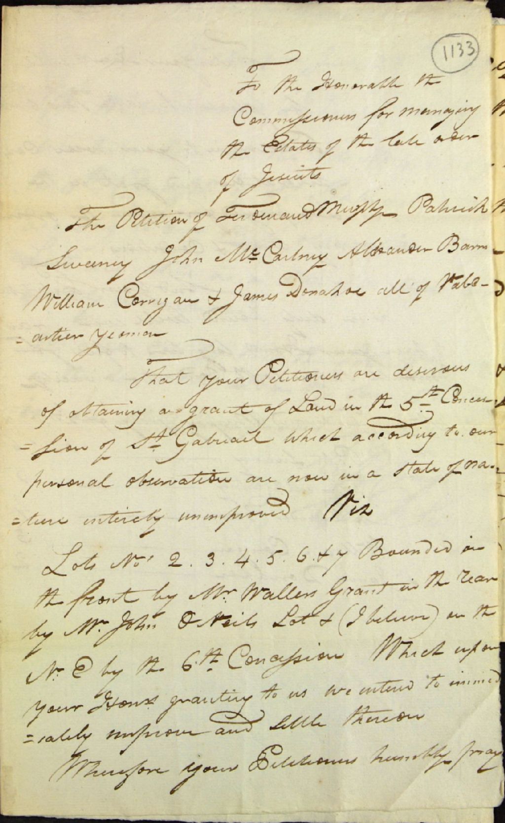 Requête de Ferdinand Murphy, Patrick Sweeny, John McCartney, Alexander Barns, William Corrigan et James Donahoe (Donahue, Donaghue), tous de Valcartier, adressée à la commission responsable de l'administration des biens des Jésuites, afin de se faire concéder les lots 2 à 7 dans la cinquième concession de la seigneurie Saint-Gabriel, et déclaration de Richard Caughtrie et Peter Sweeney selon laquelle les lots demandés ne sont pas défrichés, 25 janvier 1822, Archives nationales à Québec, Fonds Ministère des Terres et Forêts, (03Q,E21,S64,SS5,SSS6,D1133).