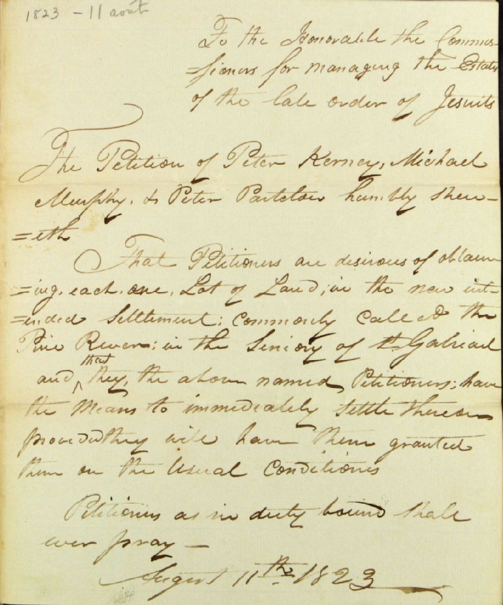 Requête de John Inri (Inrie), John Mathers, et Andrew Ker (Kerr), adressée à la commission responsable de l'administration des biens des Jésuites, afin de se faire concéder des terres à la concession de la rivière aux Pins [seigneurie Saint-Gabriel], 12 août 1823, Archives nationales à Québec, Fonds Ministère des Terres et Forêts, (03Q,E21,S64,SS5,SSS6,D1153).