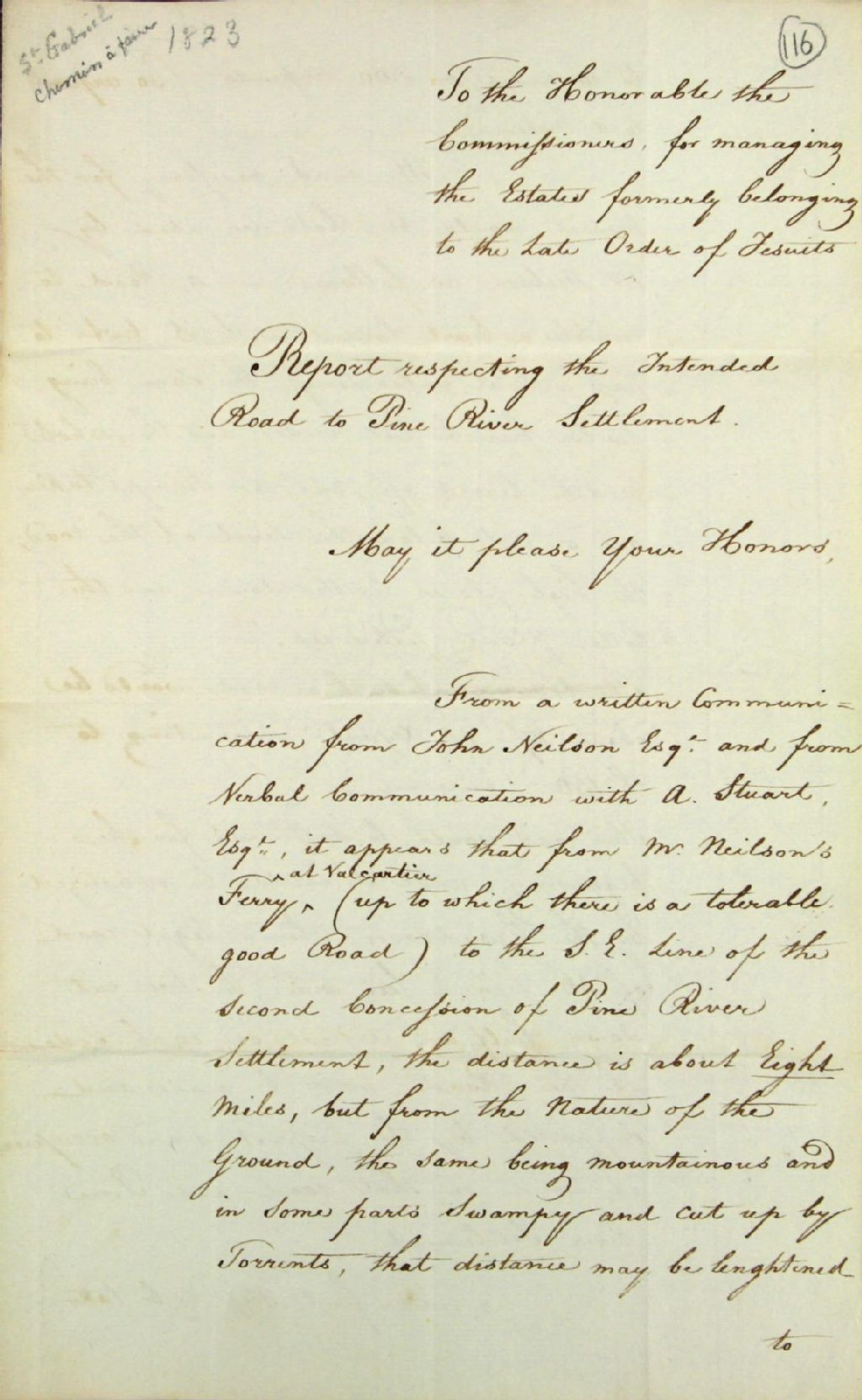 Rapport de Jasper Brewer relatif au projet de route à la concession de la rivière aux Pins dans la seigneurie Saint-Gabriel