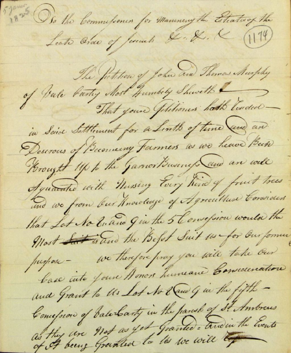 Requête de John Murphy et Thomas Murphy de Valcartier, adressée à la commission responsable de l'administration des biens des Jésuites, afin de se faire concéder les lots 8 et 9 de la cinquième concession de Valcarier dans la paroisse Saint-Ambroise [seigneurie Saint-Gabriel], et note de recommandation en faveur des requérants de Mountain, 4 janvier 1826 - 5 janvier 1826, Archives nationales à Québec, Fonds Ministère des Terres et Forêts, (03Q,E21,S64,SS5,SSS6,D1174).