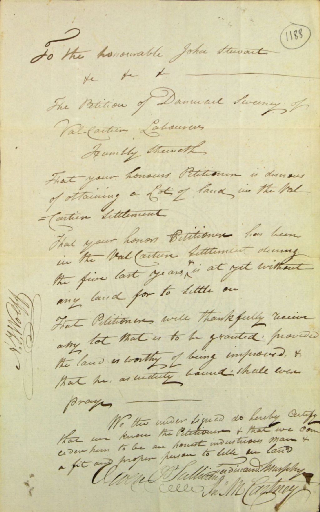 Requête de Daniel Sweeney, journalier de Valcartier, adressée à la commission responsable de l'administration des biens des Jésuites, afin de se faire concéder une terre dans la concession de Valcartier, et note de recommandation en faveur du requérant de Ferdinand Murphy, Owen O'Sullivan et John McCartney, 31 mars 1827, Archives nationales à Québec, Fonds Ministère des Terres et Forêts, (03Q,E21,S64,SS5,SSS6,D1188).