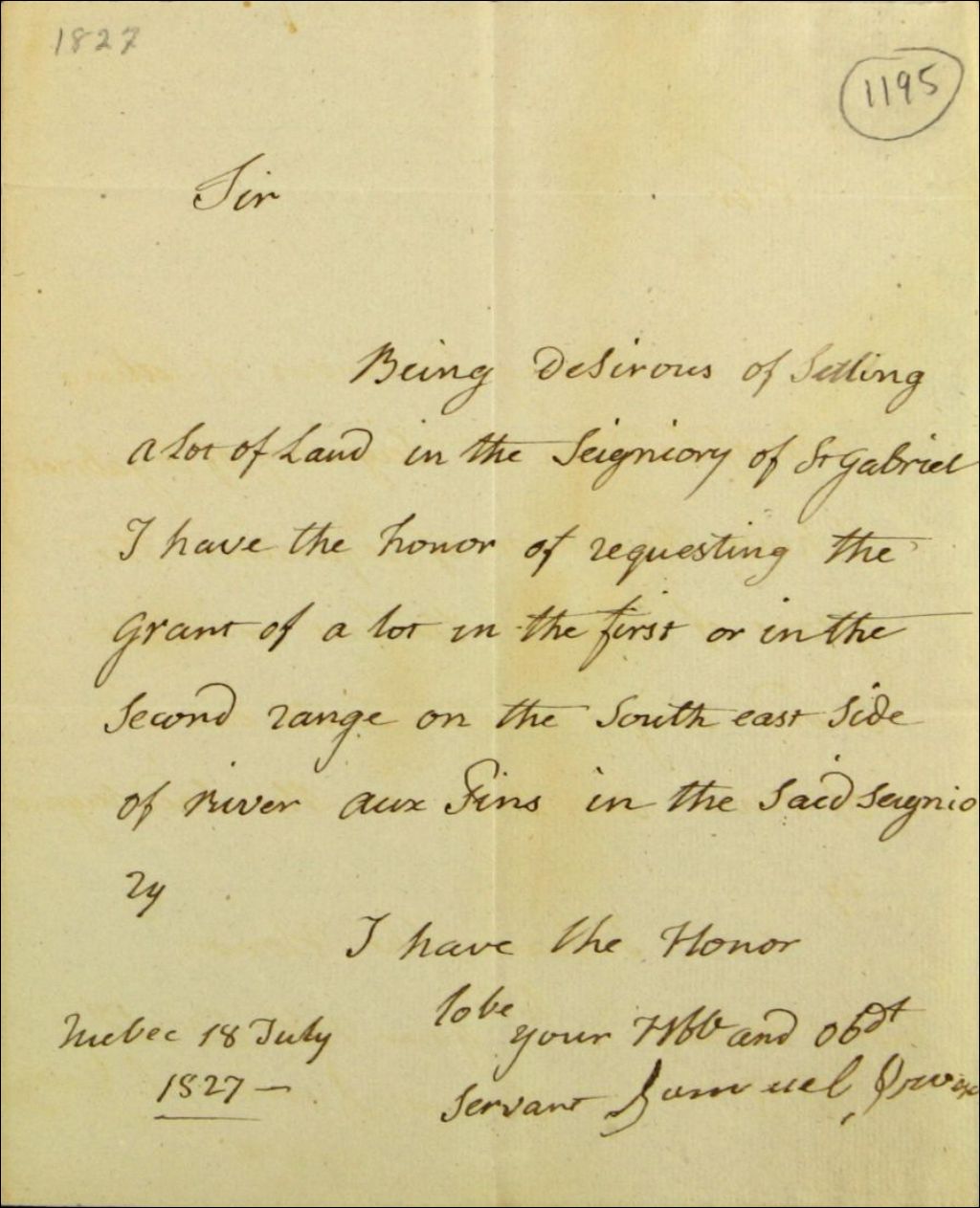 Requête de Samuel Owen (Irwin?), adressée à John Stewart, écuyer, afin de se faire concéder un lot dans le premier ou le deuxième rang au sud est de la rivière aux Pins, dans la seigneurie Saint-Gabriel, 18 juillet 1827, Archives nationales à Québec, Fonds Ministère des Terres et Forêts, (03Q,E21,S64,SS5,SSS6,D1195).