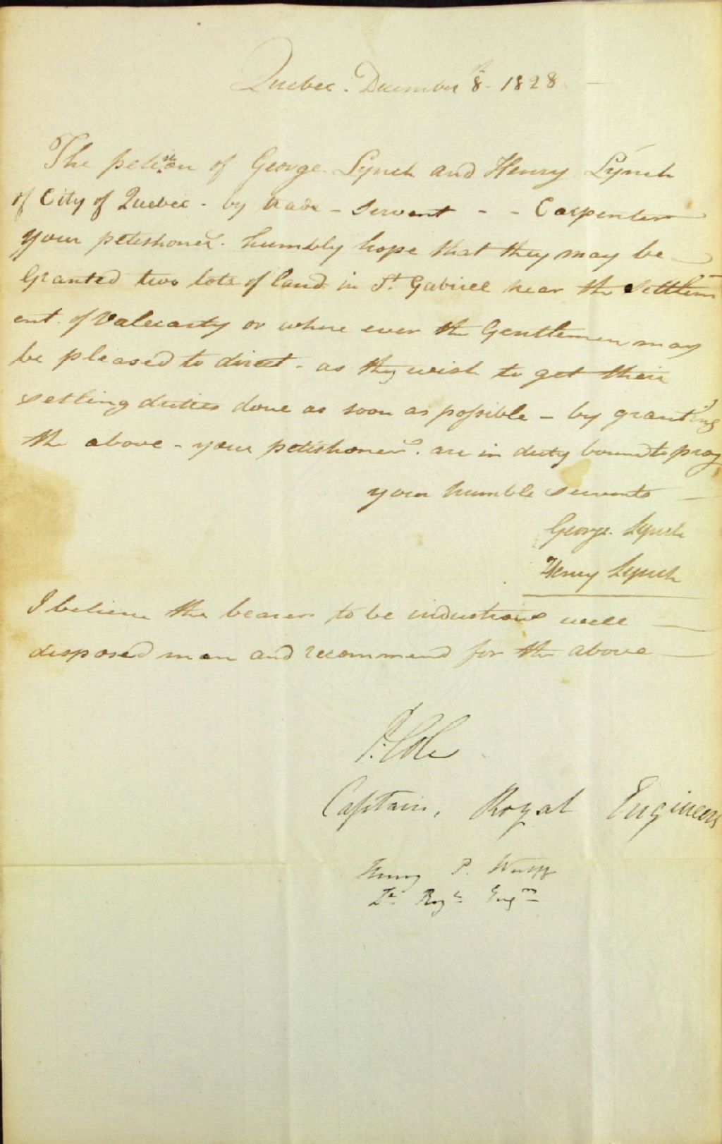Requête de George Lynch et Henry Lynch, charpentiers de Québec, adressée à la commission responsable de l'administration des biens des Jésuites, afin de se faire concéder deux lots dans [la seigneurie] Saint-Gabriel, près de la concession de Valcartier, et note de recommandation en faveur des requérants de P. Cole, capitaine des ingénieurs royaux, et Henry P. Wolff, 8 décembre 1828, Archives nationales à Québec, Fonds Ministère des Terres et Forêts, (03Q,E21,S64,SS5,SSS6,D1205).